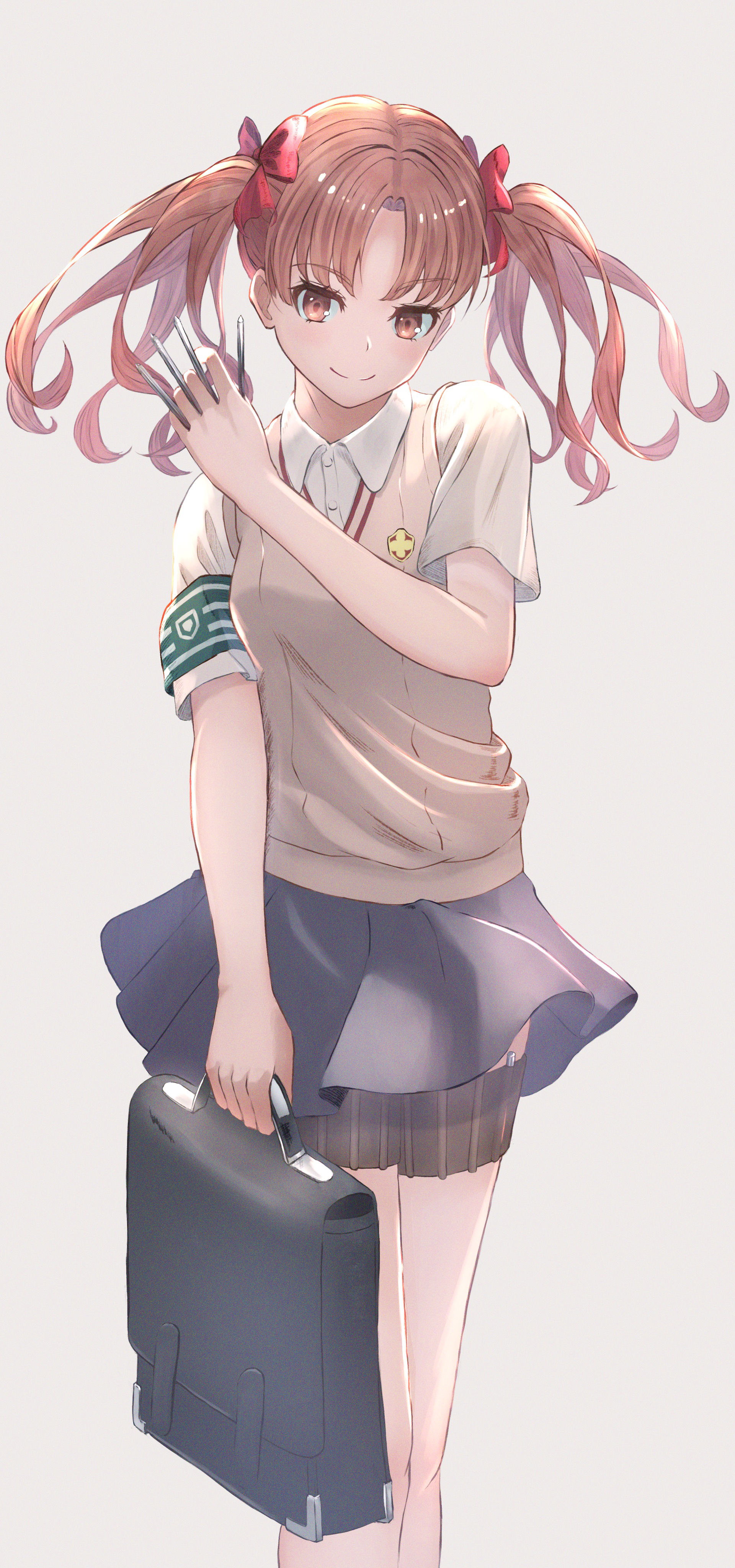 1girl absurdres armband briefcase brown_eyes brown_hair brown_sweater_vest cgrp_drawing closed_mouth collared_shirt commentary_request emblem green_armband grey_skirt highres holding holding_briefcase holding_needle judgement_armband_(toaru) long_hair miniskirt needle pleated_skirt school_briefcase school_emblem school_uniform shirai_kuroko shirt short_sleeves simple_background skirt smile solo standing summer_uniform sweater_vest thigh_strap toaru_kagaku_no_railgun toaru_majutsu_no_index tokiwadai_school_uniform twintails v-neck white_background white_shirt