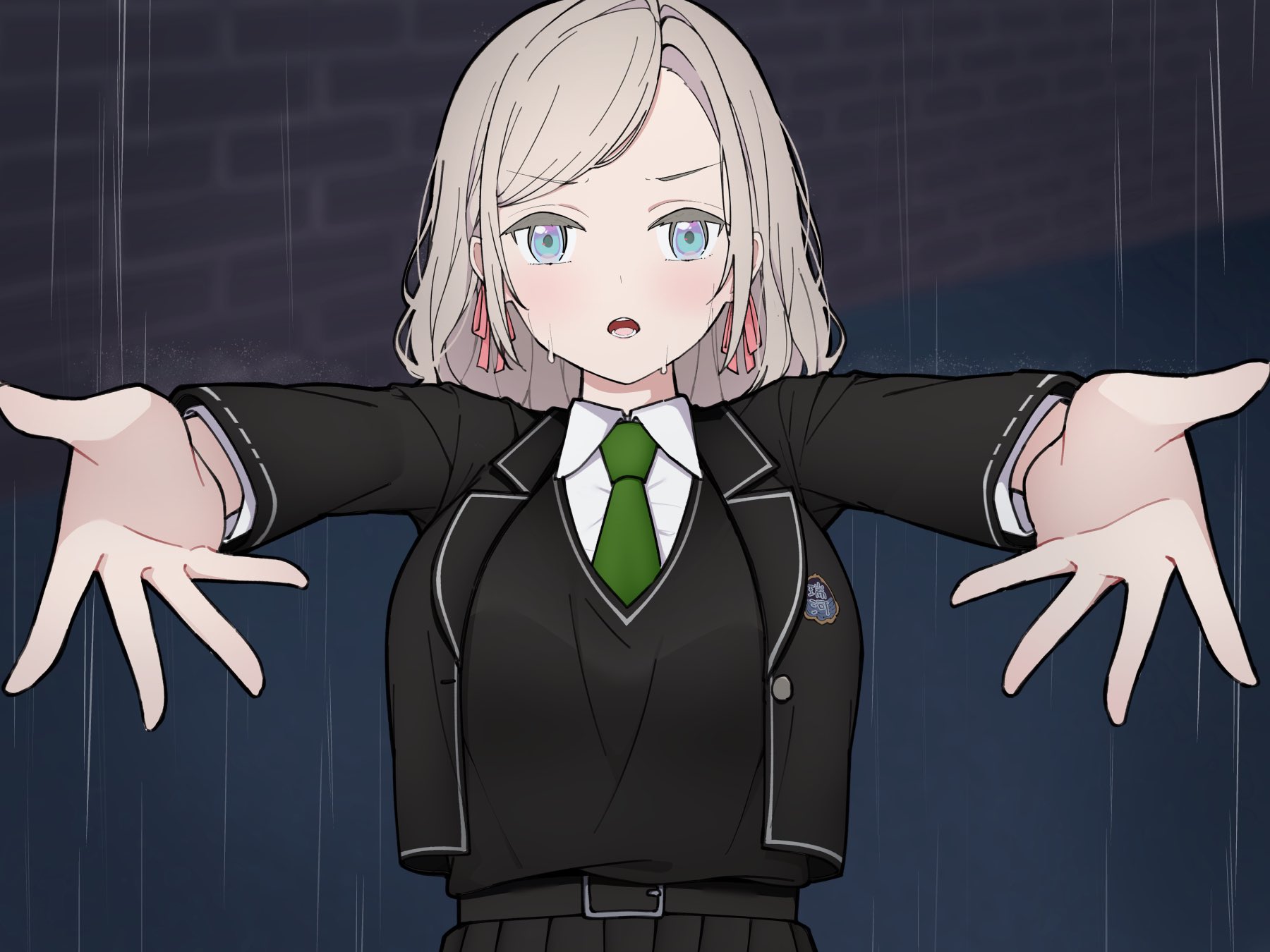 1girl black_jacket black_skirt black_sweater_vest blazer blue_eyes blurry blurry_background breasts collared_shirt commentary_request dress_shirt emblem green_necktie grey_hair hair_ribbon highres jacket large_breasts link!_like!_love_live! liz_(piyoko_piyop) long_hair looking_at_viewer love_live! mizukawa_school_uniform necktie open_clothes open_hands open_jacket open_mouth outdoors pink_ribbon pleated_skirt rain ribbon school_uniform ceras_yanagida_lilienfeld shirt skirt solo straight-on sweater_vest swept_bangs upper_body v-shaped_eyebrows wet white_shirt