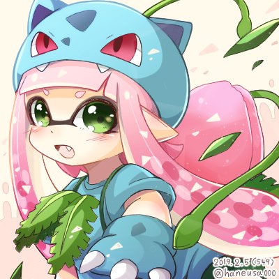 1girl blue_shirt blush character_hat commentary_request cosplay dated fang gen_1_pokemon gloves green_eyes inkling inkling_girl inkling_player_character ivysaur ivysaur_(cosplay) kurousagi_(haneusa000) long_hair lowres nintendo open_mouth pink_hair plant pointy_ears pokemon shirt solo splatoon_(series) tentacle_hair twintails vines white_background