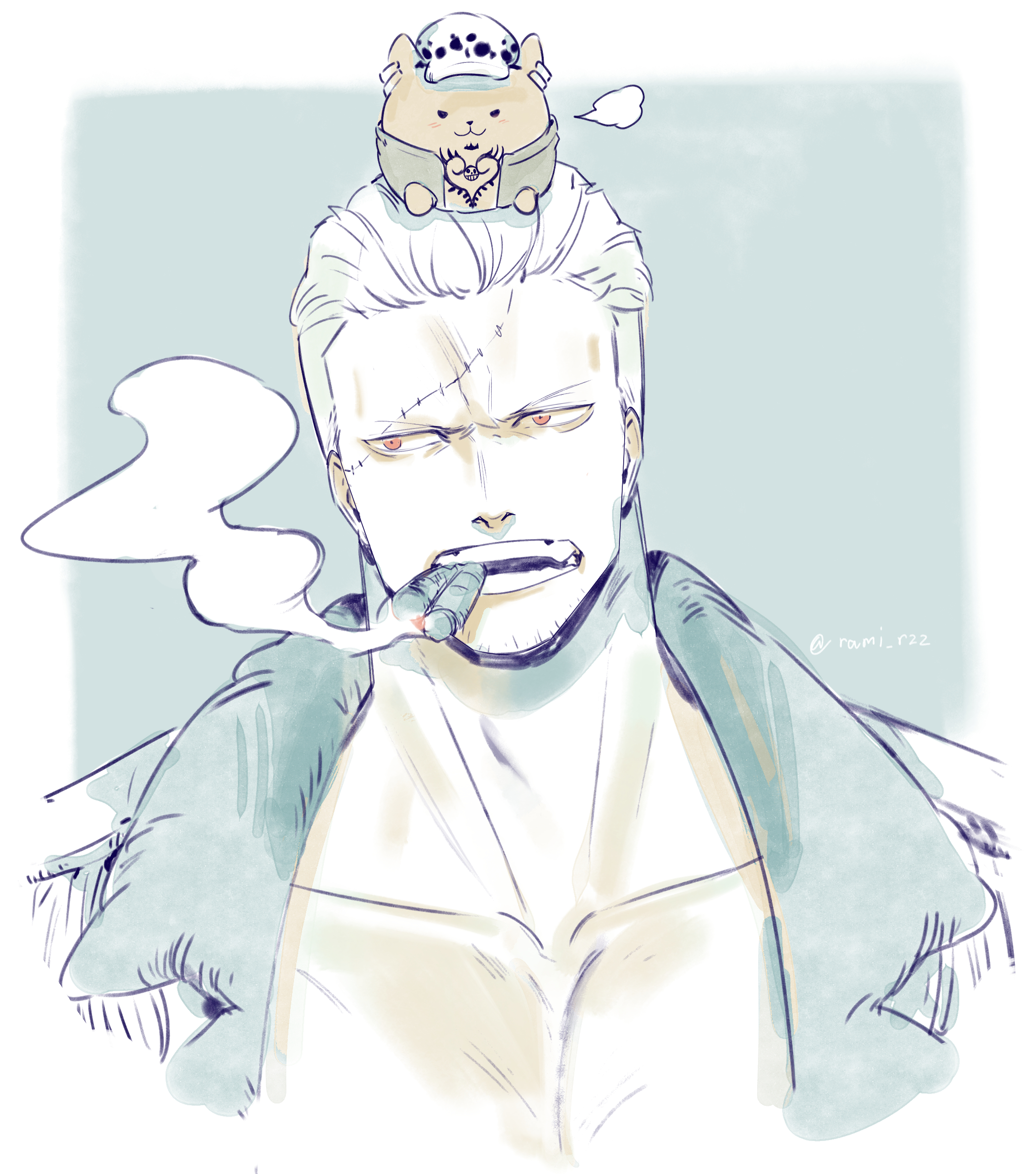 1boy absurdres animalization bare_pectorals border cigar collarbone commentary_request facial_hair goatee_stubble hat highres male_focus mature_male mouth_hold on_head one_piece pectorals rami_rz red_eyes short_hair simple_background smoke smoker_(one_piece) solo stitched_face stitches stubble teeth teeth_hold trafalgar_law twitter_username white_border