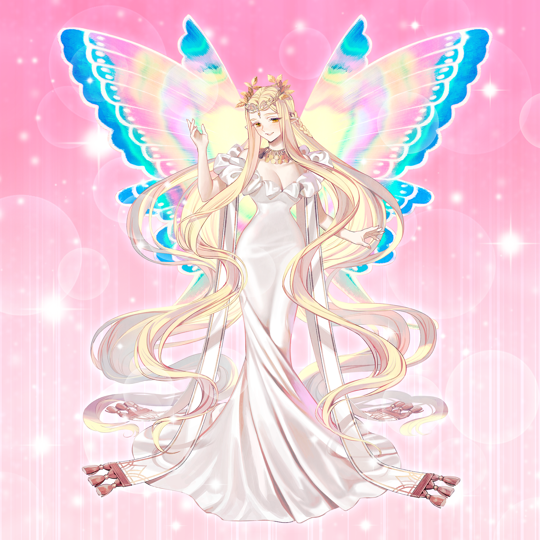 1girl absurdly_long_hair aurora_(fate) bare_shoulders blonde_hair blush breasts butterfly_wings circlet cleavage dress fairy fairy_wings fate/grand_order fate_(series) full_body game_cg hand_up head_wreath highres insect_wings jewelry large_breasts long_dress long_hair looking_at_viewer mermaid_dress multiple_wings necklace off-shoulder_dress off_shoulder official_art parted_bangs pointy_ears smile solo standing taa_(acid) tassel third-party_source very_long_hair white_dress wings yellow_eyes