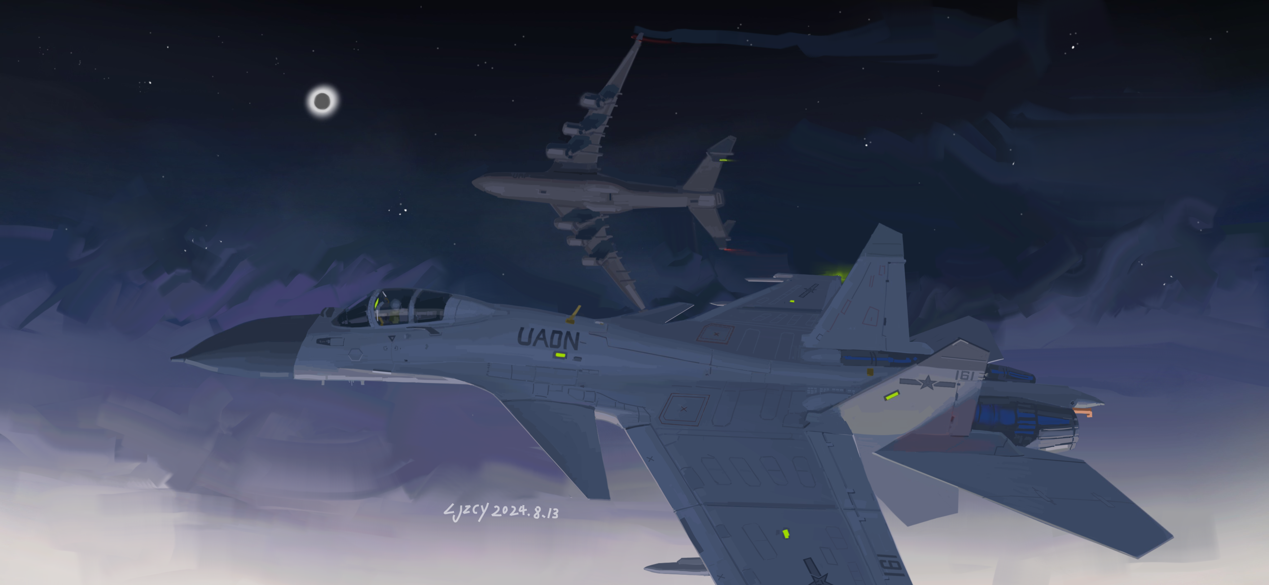 1other absurdres aircraft airplane cloud dated eclipse fighter_jet glowing highres jayatn_ljzcy military_vehicle original people's_liberation_army people's_liberation_army_navy pilot scenery shenyang_j-15 signature vehicle_focus