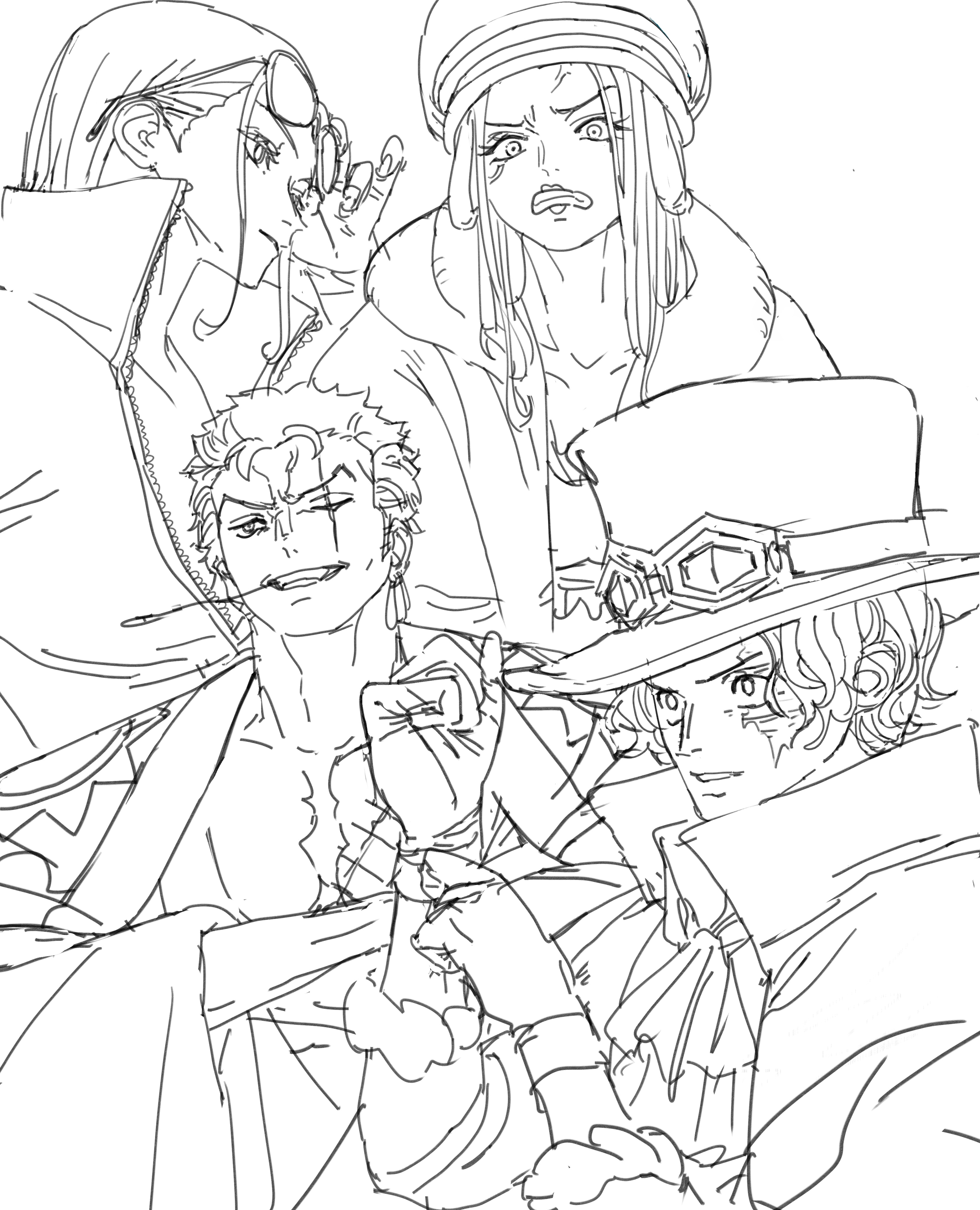 2boys 2girls absurdres anti-eyebrow_piercing black_hair clenched_teeth earrings eyewear_on_head face_piercing gloves goggles goggles_on_headwear hair_slicked_back hat high_collar highres japanese_clothes jewelry jewelry_bonney jxl8080 kimono lineart long_hair multiple_boys multiple_girls nico_robin nico_robin_(return_to_sabaody) one_piece piercing roronoa_zoro sabo_(one_piece) scar scar_across_eye scar_on_face short_hair simple_background stitched_torso stitches teeth