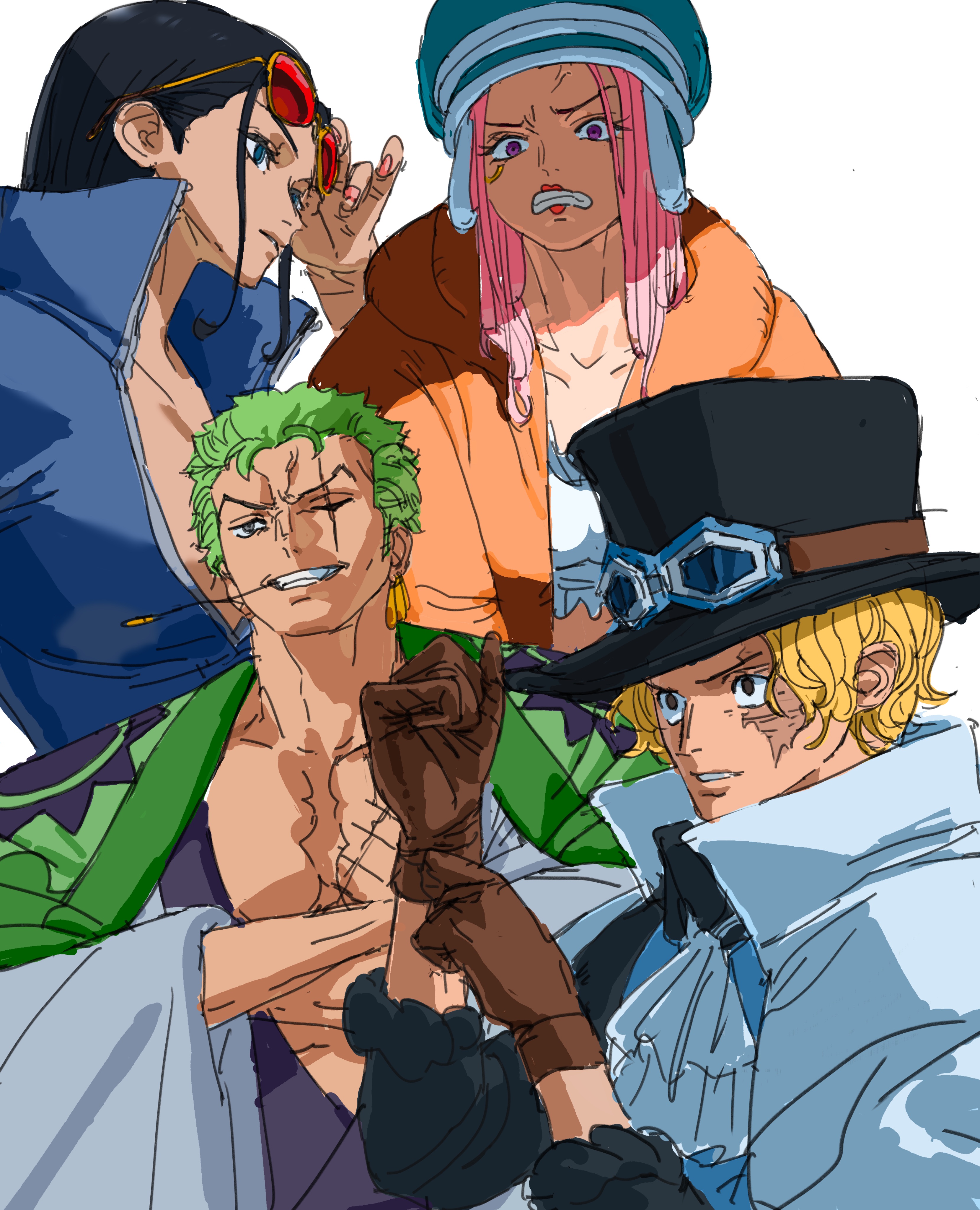 2boys 2girls absurdres anti-eyebrow_piercing ascot black_hair blonde_hair blue_shirt brown_gloves clenched_teeth earrings eyewear_on_head face_piercing gloves goggles goggles_on_headwear green_hair hair_slicked_back hat high_collar highres japanese_clothes jewelry jewelry_bonney jxl8080 kimono long_hair multiple_boys multiple_girls nico_robin nico_robin_(return_to_sabaody) one_piece piercing pink_hair roronoa_zoro sabo_(one_piece) scar scar_across_eye scar_on_face shirt short_hair stitched_torso stitches sunglasses teeth white_ascot white_background zipper