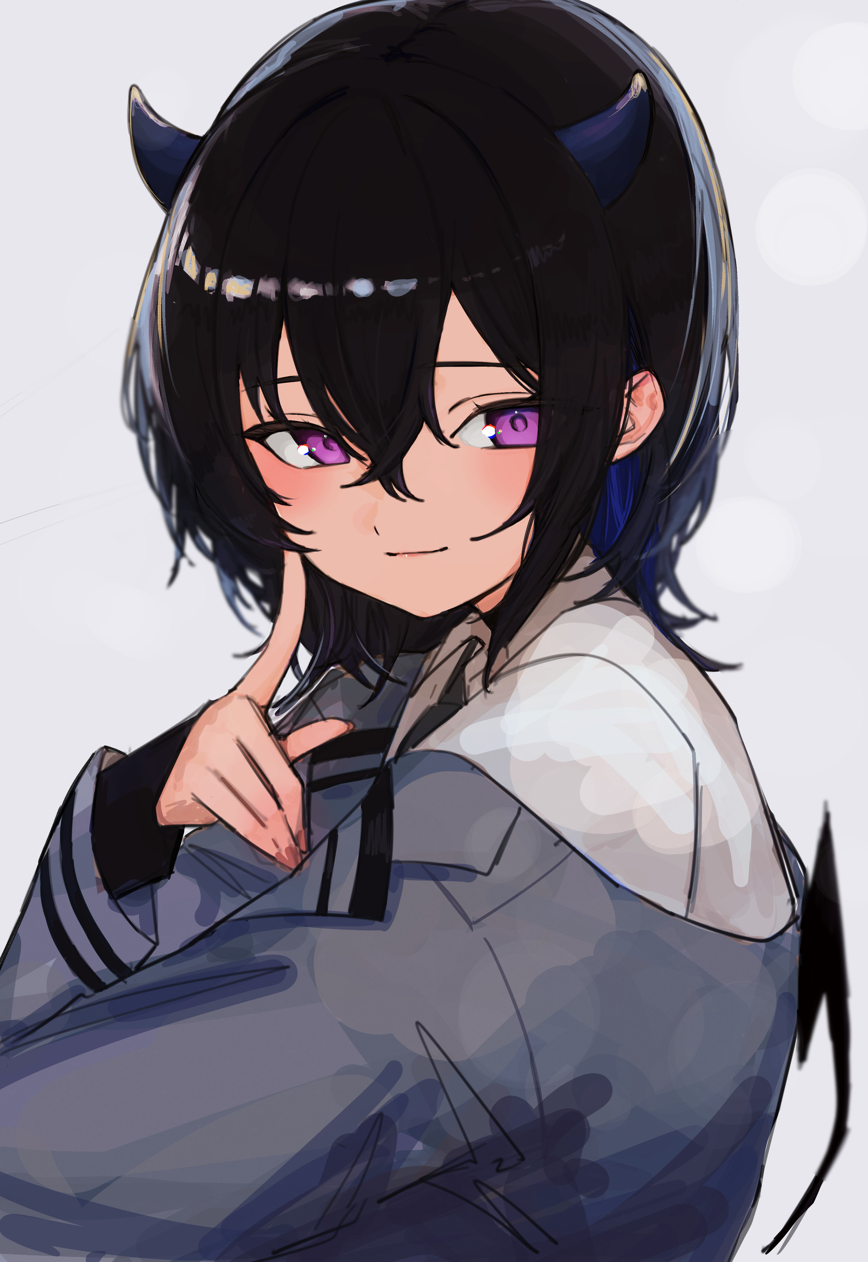 1girl absurdres black_hair blue_horns blush closed_mouth demon_horns demon_tail grey_jacket highres horns ichinose_uruha jacket purple_eyes ryo---ta shirt short_hair simple_background smile solo tail upper_body virtual_youtuber vspo! white_background white_shirt