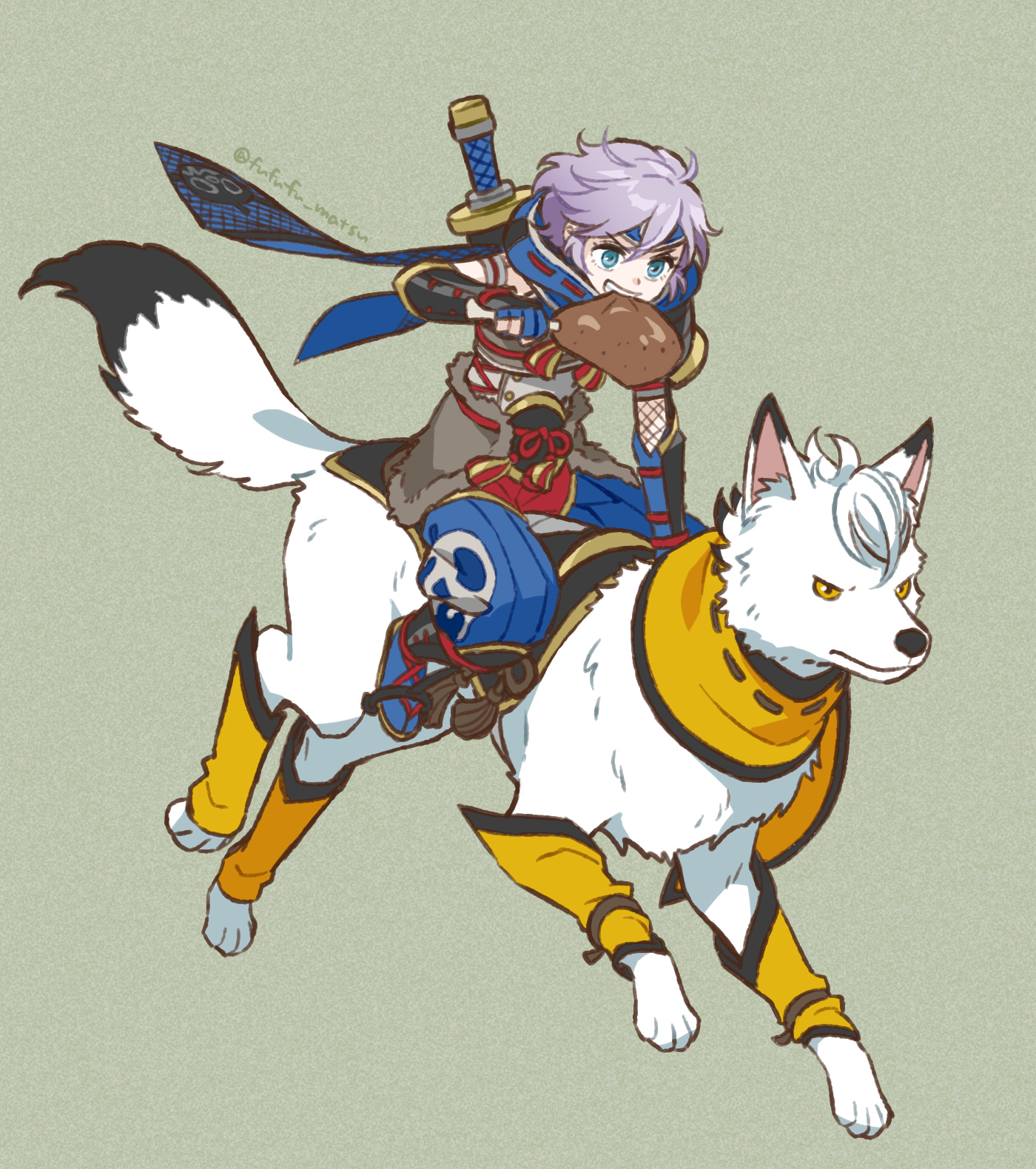 1boy alice_(see_greeeen) animal animalization blue_eyes clothing_request commentary_request eating epel_felmier food funuyu highres jack_howl jack_howl_(wolf) male_focus meat purple_hair riding sheath sheathed short_hair solo sword sword_on_back twisted_wonderland weapon weapon_on_back wolf