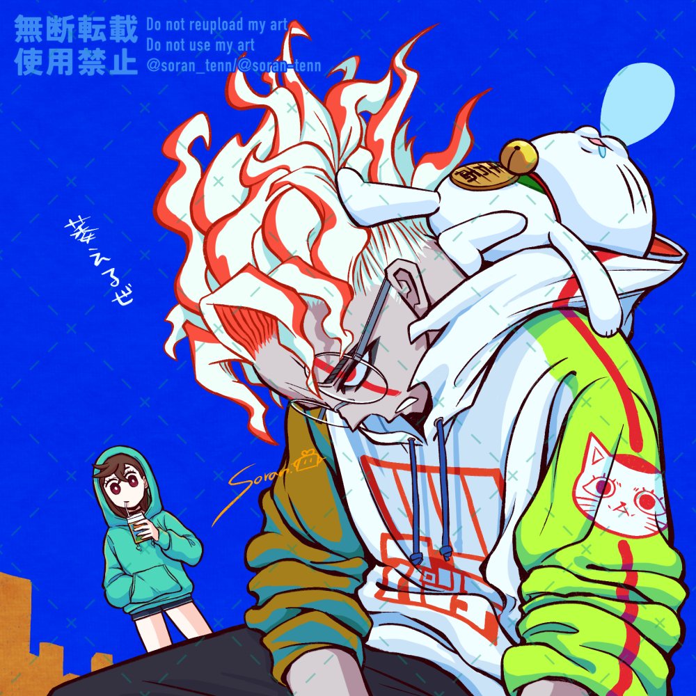 1boy 1girl alternate_form ayase_momo bell black_choker blue_background brown_eyes brown_hair cat choker colored_skin commentary_request cowboy_shot dandadan drink drinking drinking_straw earrings facial_mark glasses green_hoodie grey_skin hand_in_pocket holding holding_drink hood hood_down hoodie jewelry long_sleeves looking_at_another lying neck_bell on_back parted_lips red_eyes round_eyewear short_hair signature sitting sleeping soran_ten takakura_ken_(dandadan) takakura_ken_(transformed)_(dandadan) transformation turbo_granny_(dandadan) white_hair
