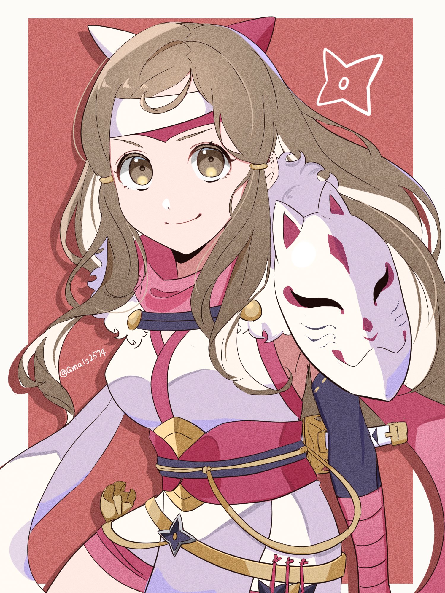 1girl border brown_eyes brown_hair closed_mouth fire_emblem fire_emblem_fates fire_emblem_heroes gmais2514 hana_(fire_emblem) hana_(ninja)_(fire_emblem) highres japanese_clothes long_hair looking_at_viewer mask mask_on_head mouth_mask ninja ninja_mask nintendo official_alternate_costume outside_border red_background shuriken smile solo twitter_username weapon white_border