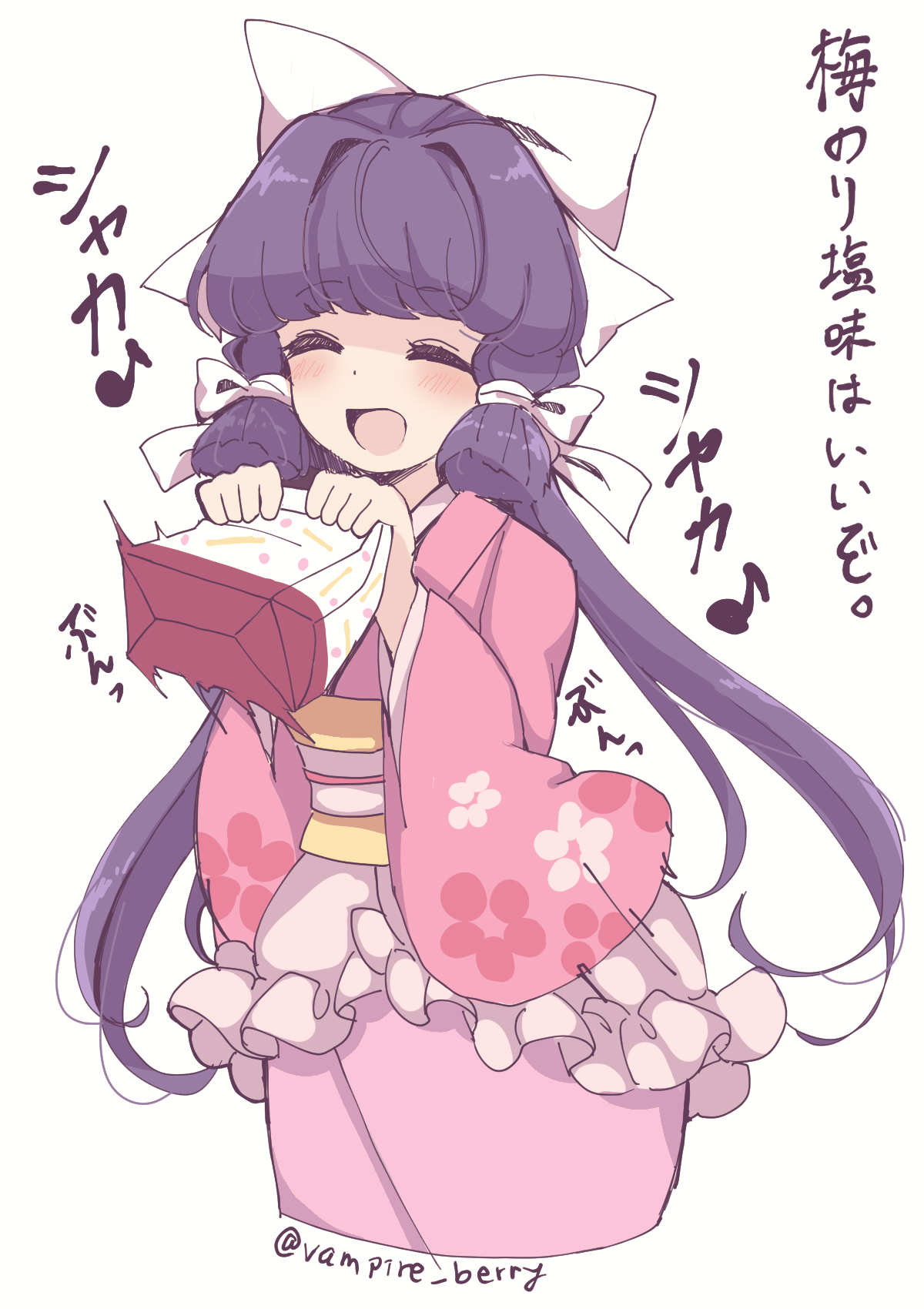 1girl ^_^ alt_text bag blunt_ends bow closed_eyes commentary_request cropped_legs dot_nose eyelashes floral_print hair_bow hair_intakes happy highres holding holding_bag japanese_clothes kimono light_blush long_hair long_sleeves loose_hair_strand multiple_hair_bows musical_note mystical_power_plant obi open_mouth original ougi_hina paper_bag pink_kimono purple_hair sash simple_background smile solo standing touhou translation_request twitter_username white_background white_bow wide_sleeves yaezaki_an yellow_sash