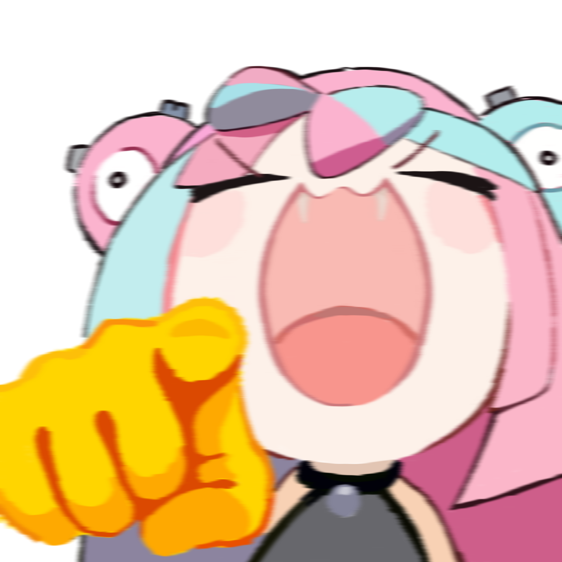 1girl bare_shoulders blue_hair blurry blush blush_stickers closed_eyes emoji fangs grey_shirt highres iono_(pokemon) laughing laughing_cat_pointing_at_you_(meme) meme multicolored_hair nintendo open_mouth pink_hair pointing pointing_at_viewer pokemon pokemon_scarlet_and_violet shirt simple_background sleeveless sleeveless_shirt solo tor_(torkrub111) two-tone_hair v-shaped_eyebrows white_background