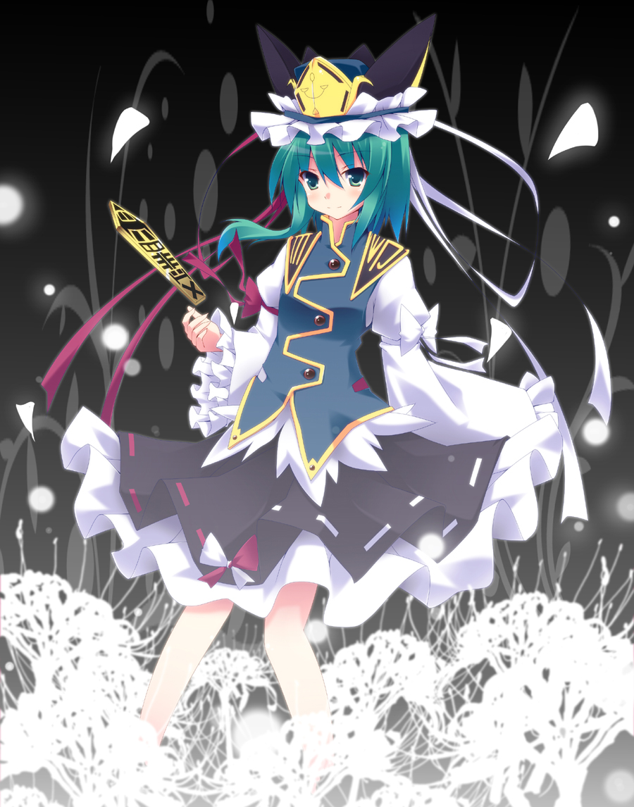 1girl bad_id bad_pixiv_id dress female_focus flower green_eyes green_hair hat kurono_yuzuko light_smile matching_hair/eyes red_flower rod_of_remorse shiki_eiki short_hair smile solo spider_lily touhou white_flower white_spider_lily wide_sleeves