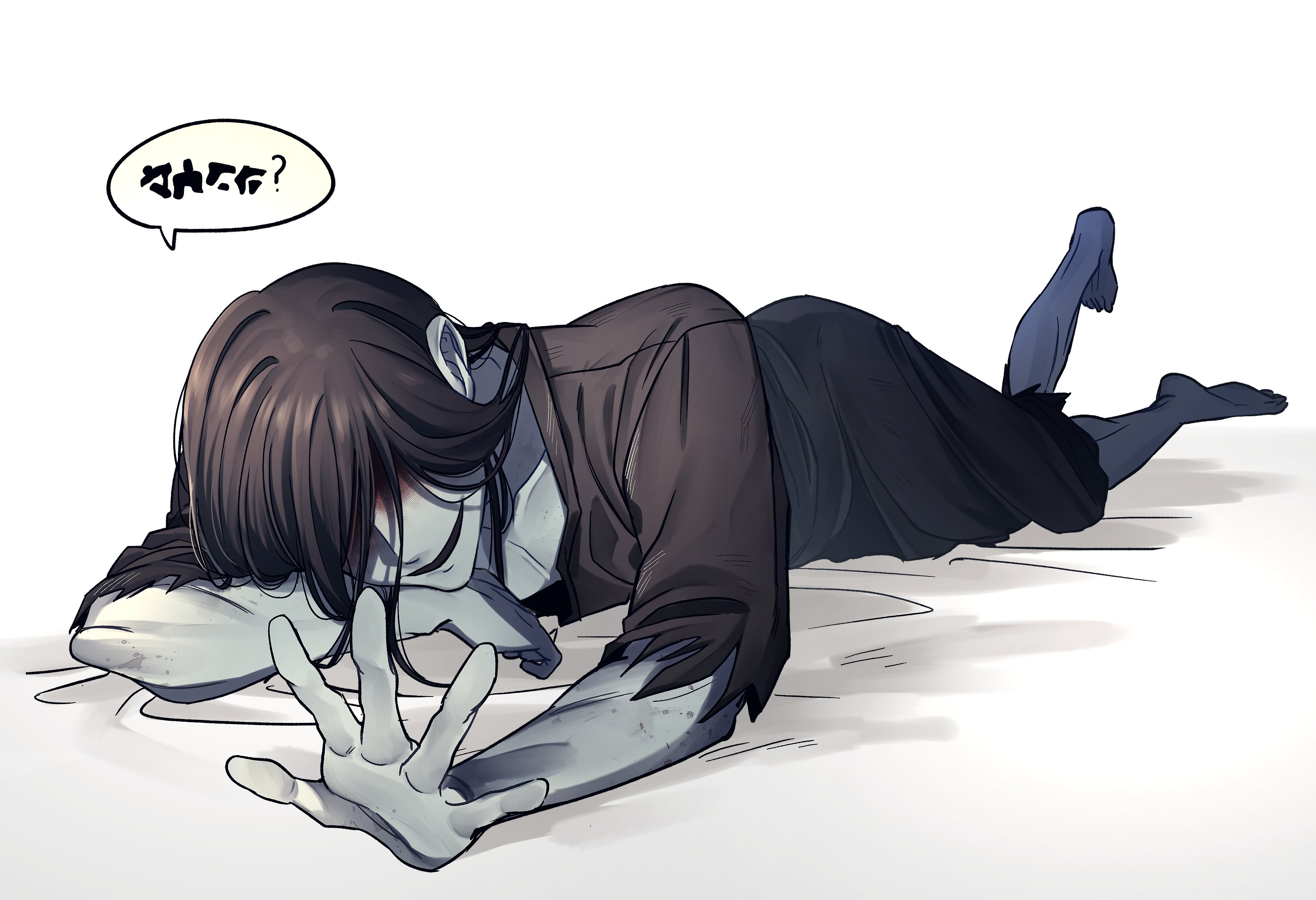 1boy absurdres black_hair black_kimono blood blood_on_face commentary english_commentary eodeokgye_0 highres homicipher homicipher_text japanese_clothes kimono long_hair lying male_focus mr._crawling on_stomach simple_background solo white_background