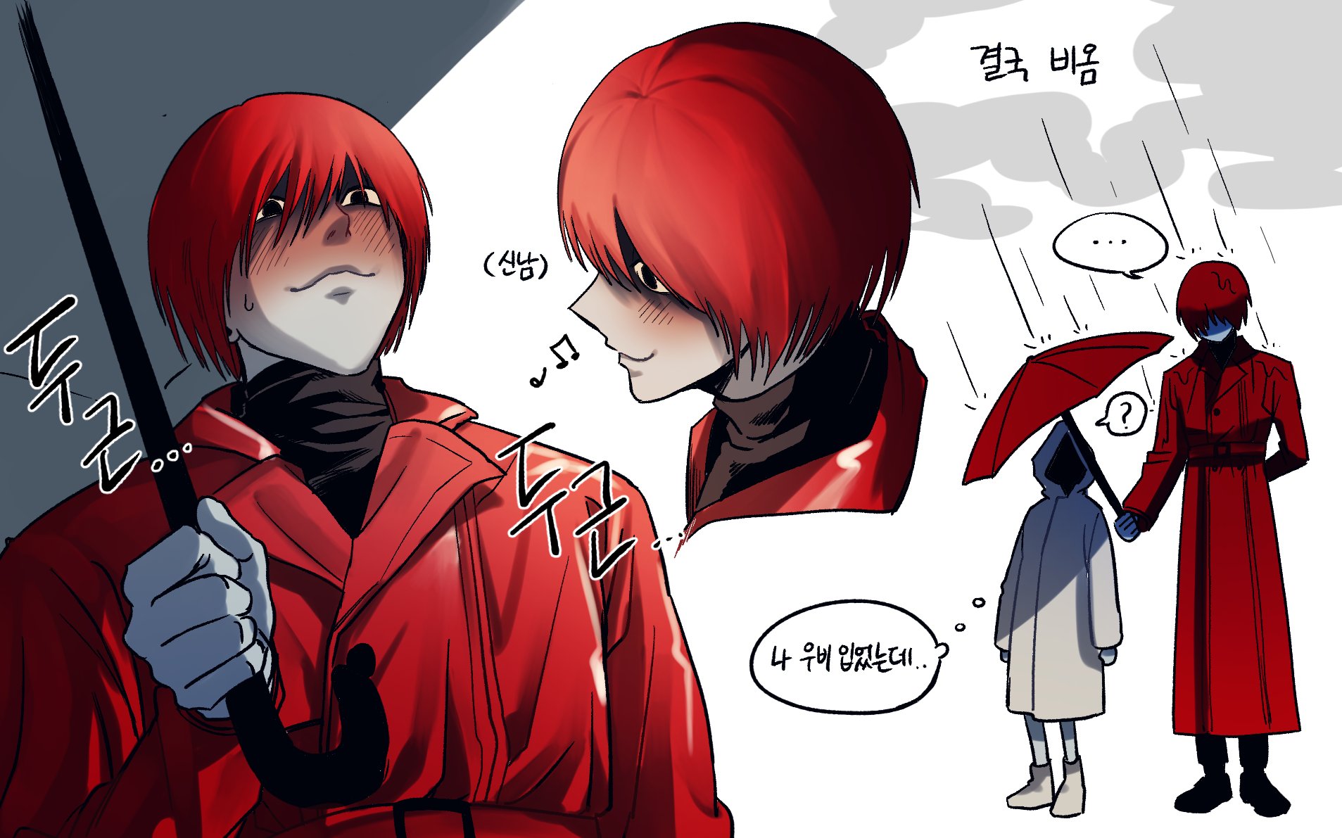 1boy 1girl blush coat commentary dilated_pupils english_commentary eodeokgye_0 adashino_adami highres holding holding_umbrella homicipher korean_commentary korean_text mixed-language_commentary mr._scarletella multiple_views rain raincoat red_coat red_eyes red_hair red_umbrella short_hair smile translation_request umbrella wet