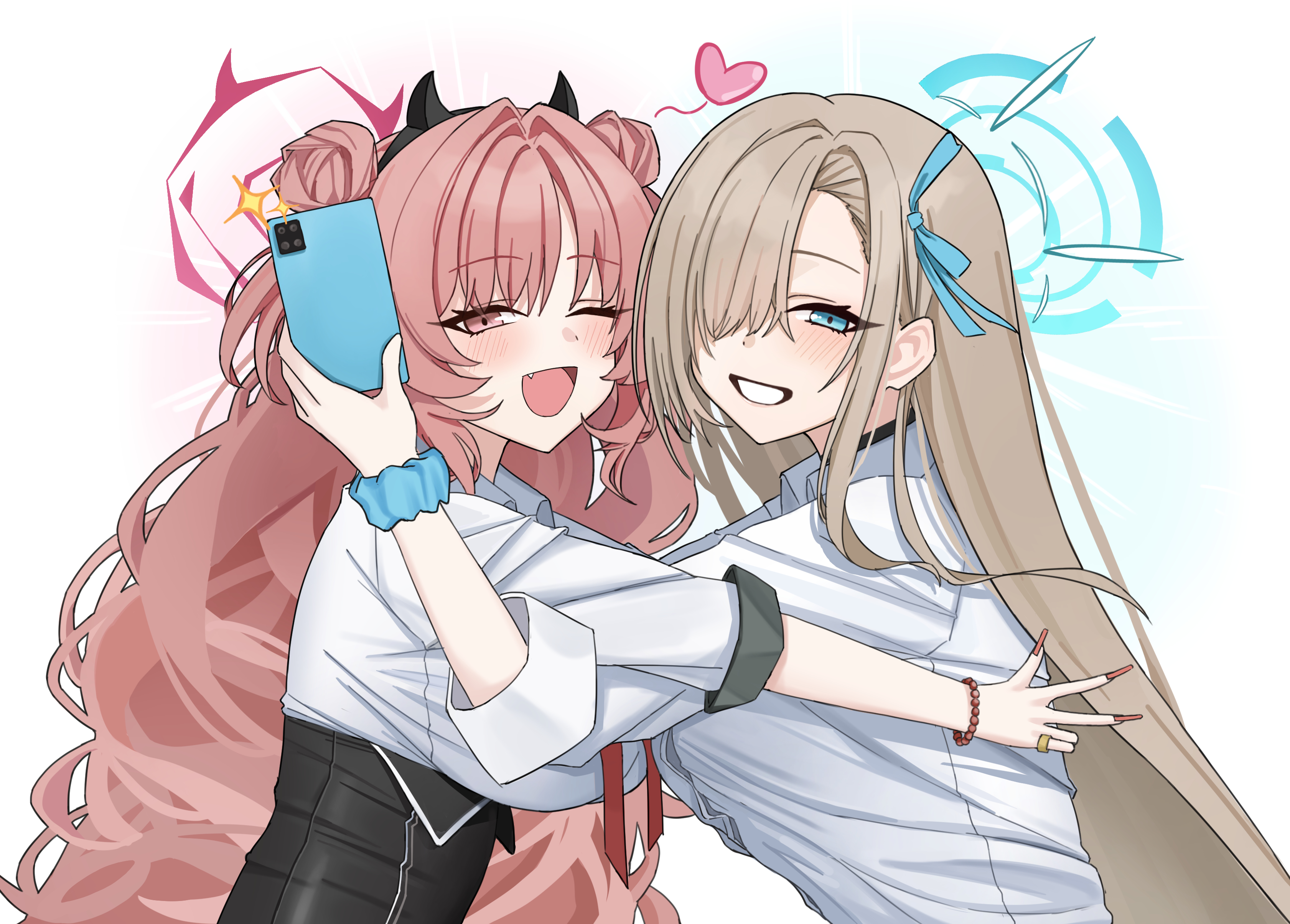 2girls absurdres asuna_(blue_archive) asuna_(school_uniform)_(blue_archive) bad_anatomy bad_hands bead_bracelet beads black_choker black_skirt blue_archive blue_eyes blue_halo blue_ribbon blue_scrunchie blush bracelet brown_hair choker collared_shirt commentary_request demon_horns double_bun doumu_(31678316) fake_horns fingernails gyaru hair_bun hair_intakes hair_over_one_eye hair_ribbon hairband halo heart high-waist_skirt highres holding holding_phone horn_hairband horns hug jewelry kirara_(blue_archive) long_fingernails long_hair looking_at_viewer multiple_girls one_eye_closed open_mouth phone pink_eyes pink_hair pink_halo red_nails ribbon scrunchie shirt short_sleeves simple_background skirt sleeves_rolled_up smile upper_body w white_background white_shirt wrist_scrunchie