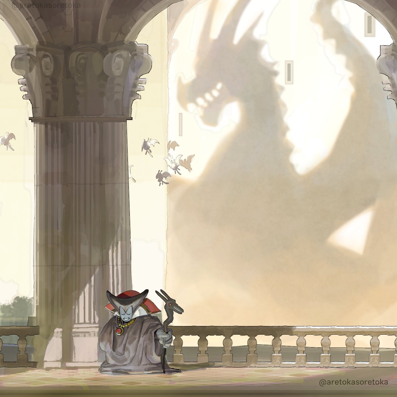 1boy 5others aretokasoretoka black_horns blue_skin closed_eyes colored_skin commentary_request dracky dragon dragon_boy dragon_lord dragon_quest dragon_quest_i gem grin highres holding holding_staff horns jewelry male_focus monster_boy multiple_others necklace pillar purple_robe red_gem robe shadow silhouette smile solo_focus staff twitter_username