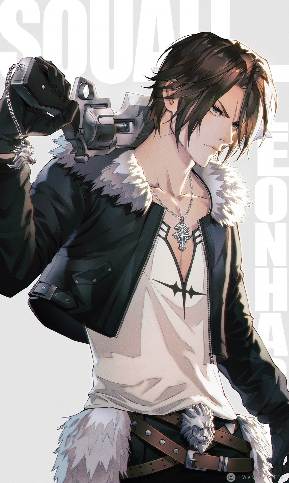 1boy belt black_gloves black_jacket blue_eyes brown_hair character_name closed_mouth collarbone commentary cropped_jacket final_fantasy final_fantasy_viii fur-trimmed_jacket fur_trim gloves highres holding holding_weapon jacket jewelry long_sleeves male_focus necklace open_clothes open_jacket over_shoulder scar scar_on_face scar_on_forehead serious shirt short_hair solo squall_leonhart upper_body wandzardeen weapon white_shirt