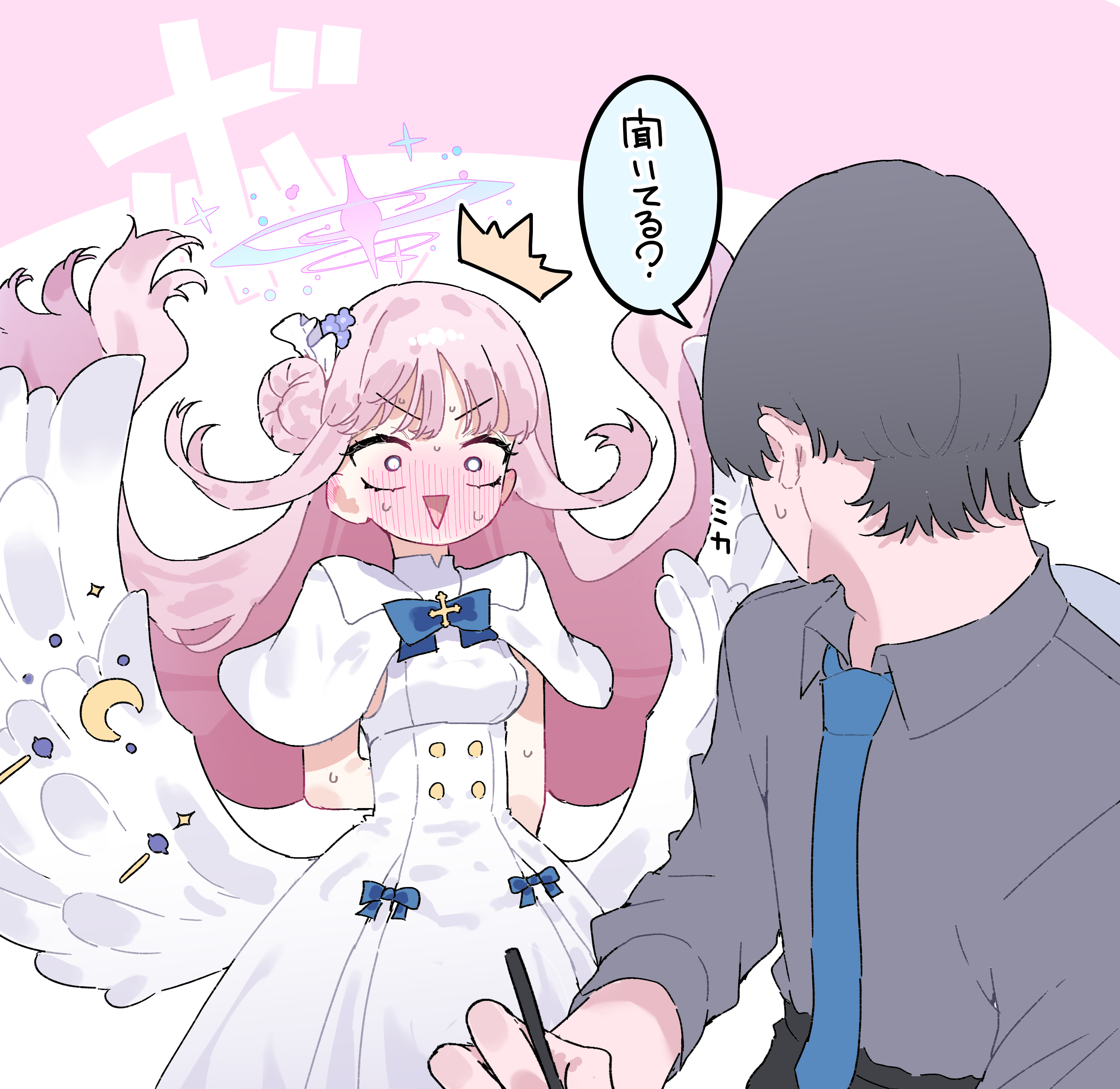 1boy 1girl absurdres angel_wings arms_behind_back blue_archive blue_necktie blush breasts bright_pupils clothing_cutout collared_shirt commentary dress eye_contact full-face_blush gradient_halo grey_shirt hair_bun hair_ornament halo highres holding holding_pen long_hair long_sleeves looking_at_another looking_back medium_breasts mika_(blue_archive) momico_co multicolored_halo necktie open_mouth pen pink_background pink_hair pink_halo sanpaku sensei_(blue_archive) shirt short_sleeves side_cutout sweat two-tone_background two-tone_halo very_long_hair white_background white_dress white_pupils white_wings wings