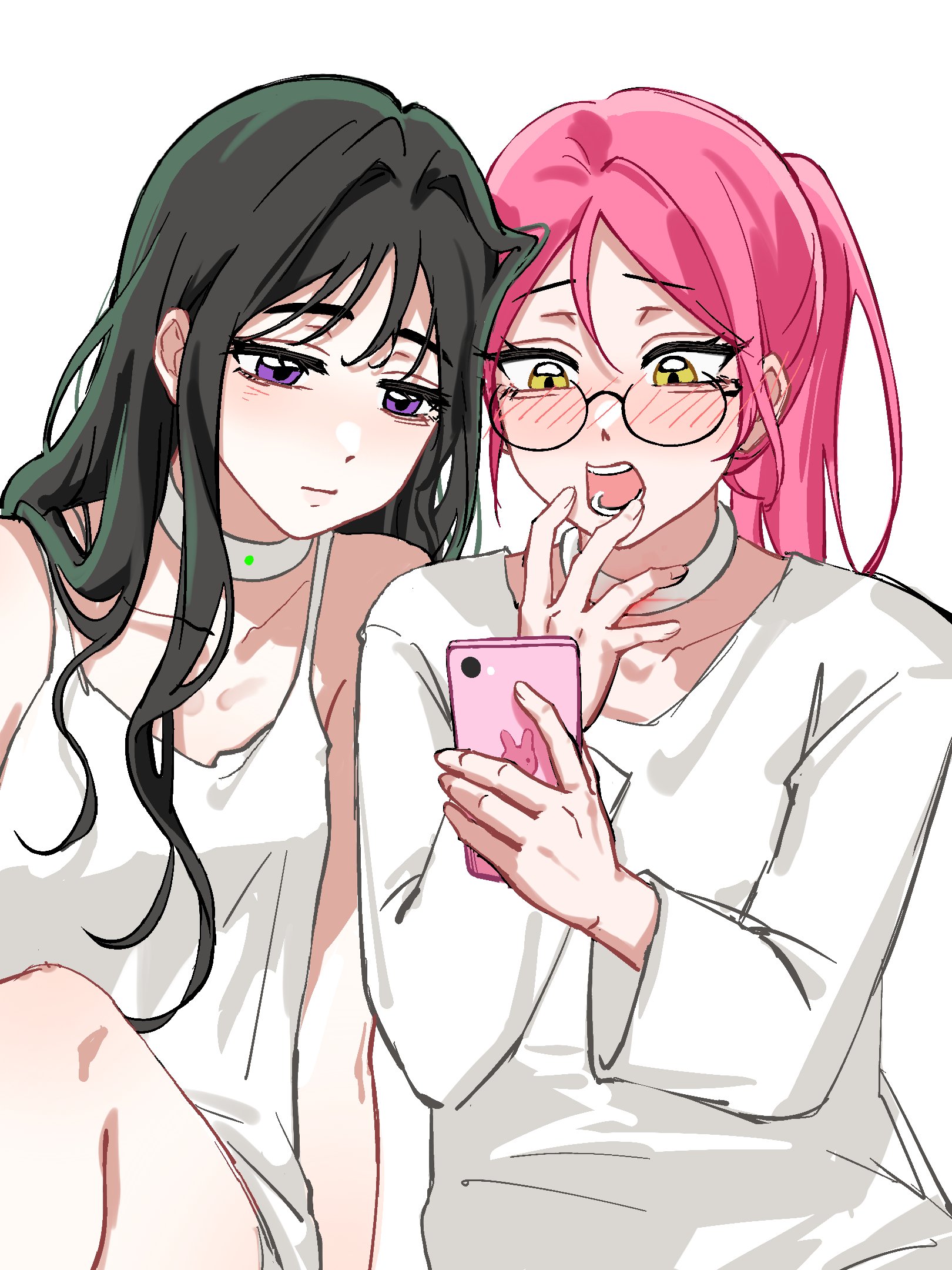 2girls alien_stage black_hair blush cellphone chinese_commentary choker commentary dress hand_on_own_face hanye50900348 highres holding holding_phone long_hair mizi_(alien_stage) multiple_girls open_mouth pants phone pink_hair ponytail purple_eyes round_eyewear shirt sitting sleeveless sleeveless_dress smartphone sua_(alien_stage) very_long_hair white_background white_choker white_dress white_pants white_shirt yellow_eyes