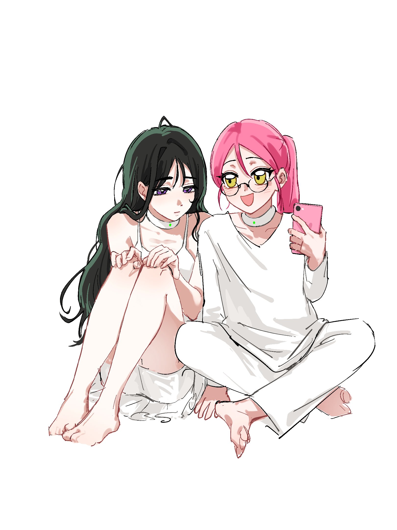 2girls alien_stage barefoot black_hair cellphone chinese_commentary choker commentary dress full_body hanye50900348 highres holding holding_phone knees_up long_hair mizi_(alien_stage) multiple_girls open_mouth pants phone pink_hair ponytail purple_eyes round_eyewear shirt sitting sleeveless sleeveless_dress smartphone smile sua_(alien_stage) very_long_hair white_background white_choker white_dress white_pants white_shirt yellow_eyes