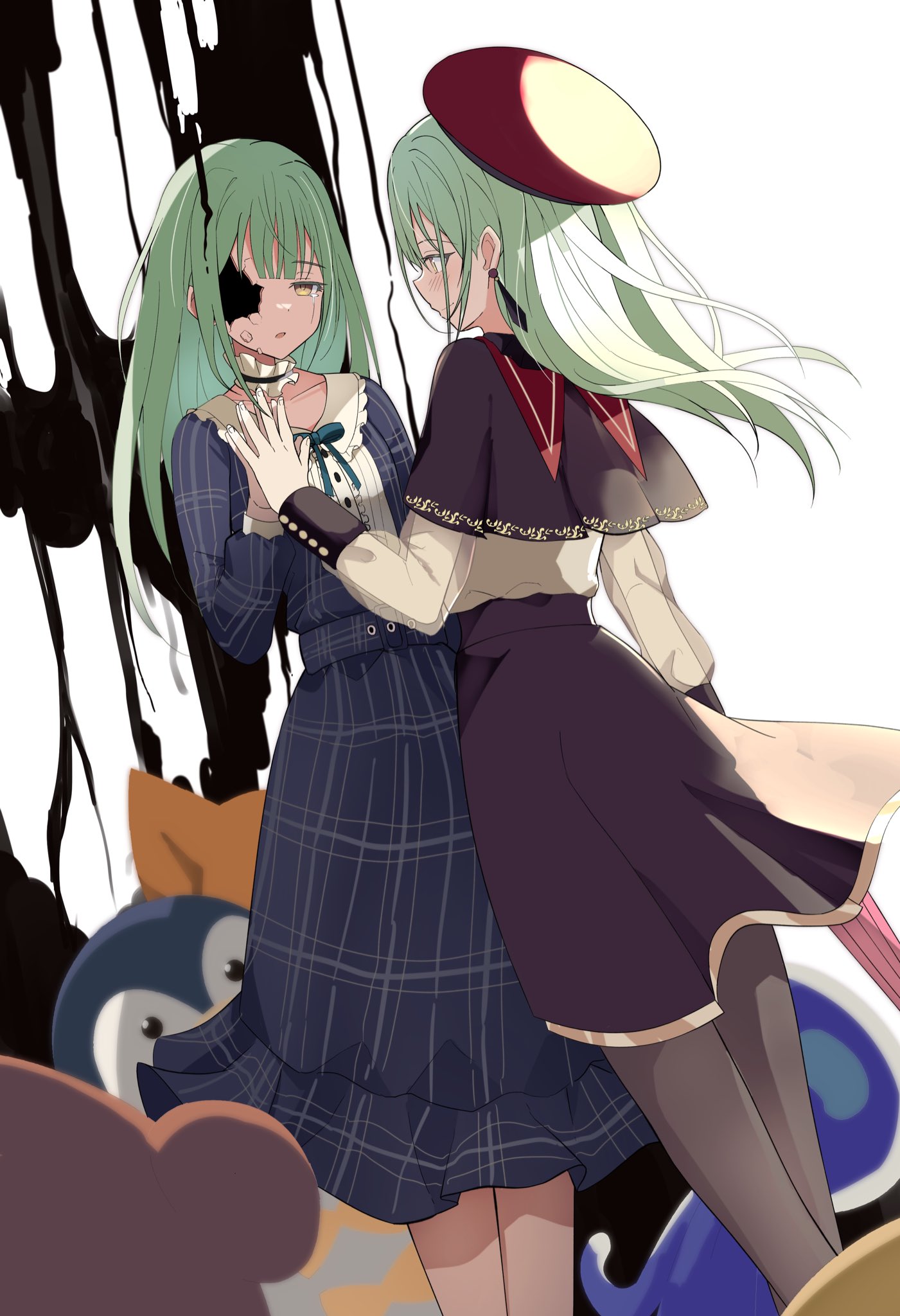 2girls bang_dream! bang_dream!_it's_mygo!!!!! black_capelet black_pantyhose black_skirt blue_dress blush broken capelet closed_mouth commentary crying crying_with_eyes_open dress dual_persona green_hair hashtag-only_commentary hat highres koshian_(taiyaki) long_hair long_sleeves mortis_(bang_dream!) mortis_(costume)_(bang_dream!) mortis_(persona)_(bang_dream!) multiple_girls open_mouth pantyhose plaid_clothes plaid_dress red_hat shirt sidelocks skirt stuffed_animal stuffed_penguin stuffed_toy tears wakaba_mutsumi white_shirt yellow_eyes