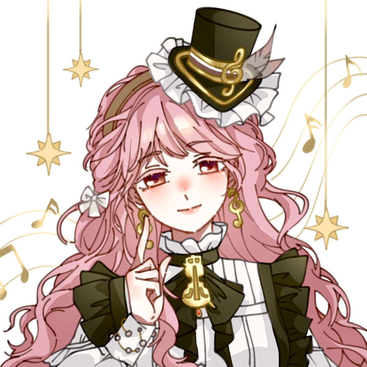1girl bead_bracelet beads bow bowtie bracelet braid brooch brown_hairband chinese_commentary closed_mouth collared_shirt colored_eyelashes commentary_request dot_nose dress earrings fanfanjiadeayuanjiang frilled_dress frilled_headwear frilled_shirt_collar frills gold_earrings green_bow green_bowtie green_dress green_hat hair_bow hairband happy hat hat_feather hat_ornament high_collar highres infinity_nikki instrument jewelry light_blush lips long_hair long_sleeves looking_at_viewer mini_hat mini_top_hat musical_note_earrings musical_note_hat_ornament nikki_(series) pinafore_dress pink_eyes pink_hair pink_lips pointing pointing_up puffy_long_sleeves puffy_sleeves shirt side_braids simple_background single_sidelock sleeveless sleeveless_dress smile solo musical_staff star_(symbol) symphony_of_strings_(infinity_nikki) top_hat treble_clef twin_braids upper_body very_long_hair violin wavy_hair white_background white_bow white_shirt