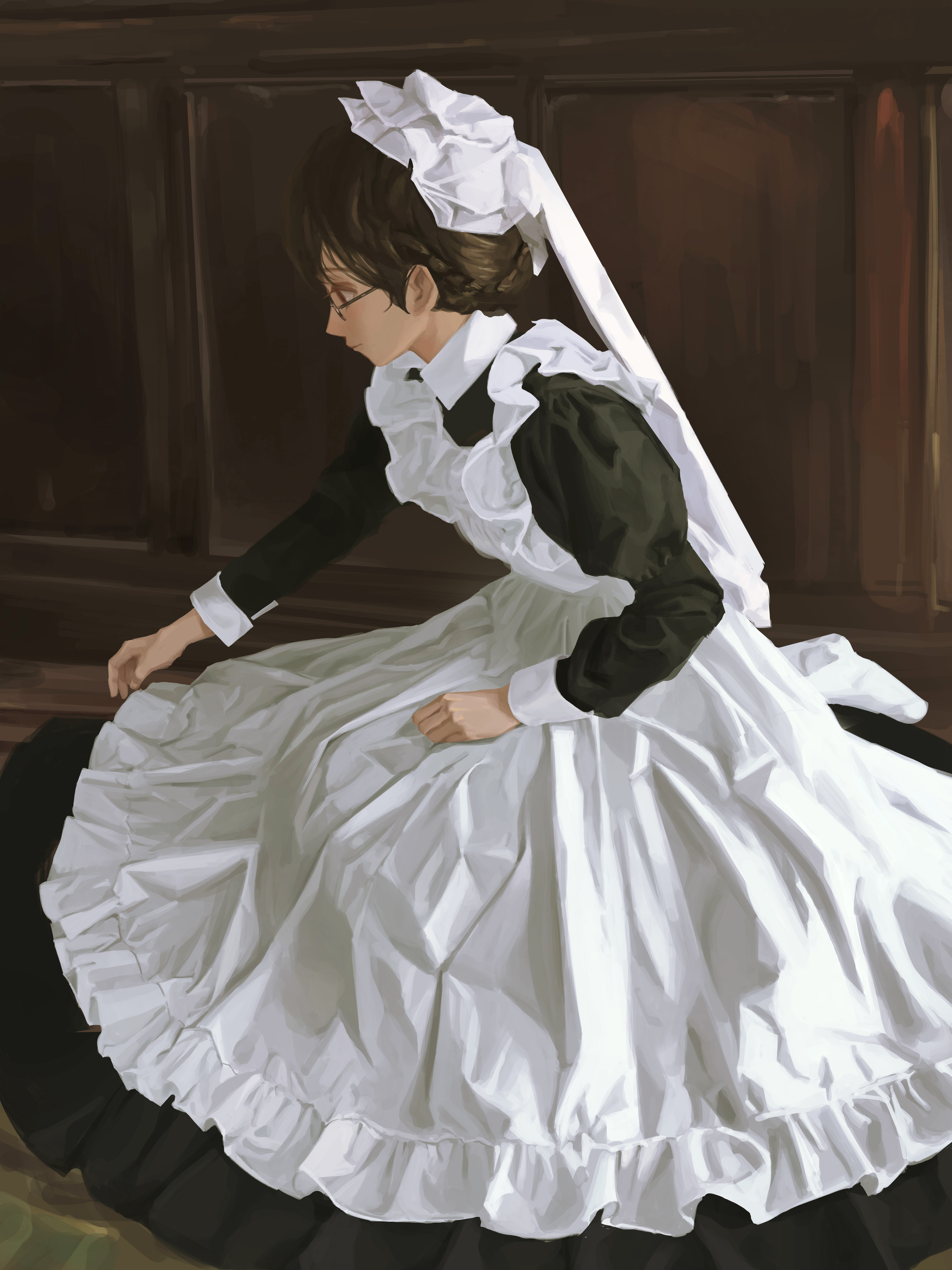 1girl absurdres brown_eyes brown_hair commentary dress from_side glasses highres long_dress long_sleeves maid original short_hair solo zigou