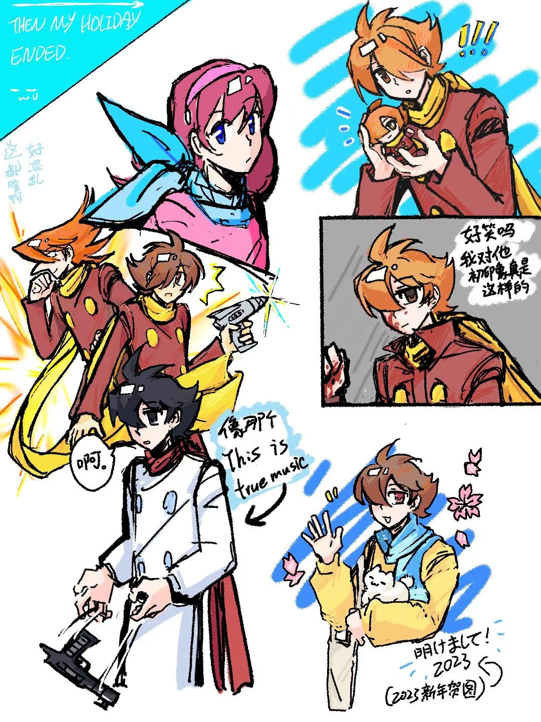1girl 2boys black_hair blue_eyes blue_scarf brown_eyes brown_hair coat cyborg cyborg_009 flow669676 hair_over_one_eye highres long_hair looking_at_viewer multiple_boys orange_hair pink_hair red_coat scarf short_hair white_coat yellow_scarf