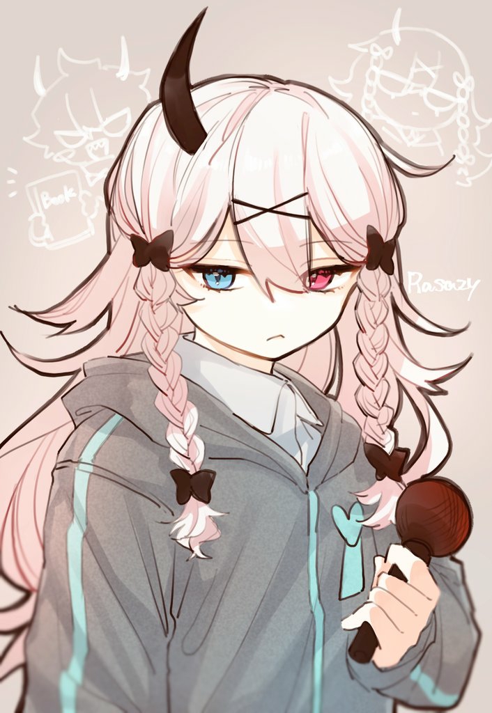1boy 1girl :< arm_at_side black_bow black_horns blue_eyes bow braid brother_and_sister brown_background character_name closed_mouth collared_shirt commentary_request double-parted_bangs eyes_visible_through_hair flat_chest friday_night_funkin' grey_jacket hair_between_eyes hair_bow hair_ornament heart heterochromia holding holding_microphone hood hood_down horns humanization jacket long_hair long_sleeves microphone mid-fight_masses ozu_(user_sjjz4357) pink_eyes puffy_long_sleeves puffy_sleeves rasazy_(mid-fight_masses) selever_(mid-fight_masses) shirt siblings simple_background single_horn single_vertical_stripe solo_focus tsurime twin_braids upper_body white_hair white_shirt x_hair_ornament