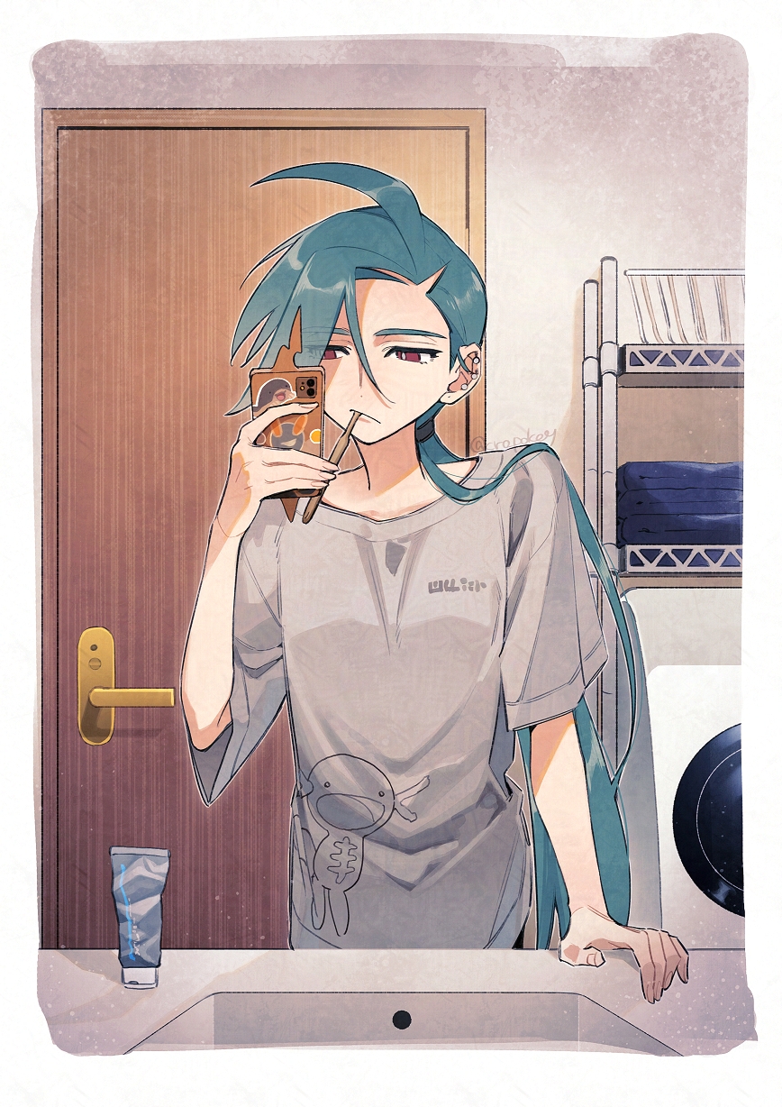 1girl ahoge alternate_costume aqua_hair bathroom border bright_pupils character_print clodsire door ear_piercing expressionless gen_4_pokemon green_hair grey_shirt hand_up highres holding holding_phone indoors long_hair low_ponytail mouth_hold nintendo paldean_wooper phone piercing pokemon pokemon_scarlet_and_violet ponytail red_eyes rika_(pokemon) rotom rotom_phone selfie shirt shougo-akira sink solo swept_bangs toothbrush toothbrush_in_mouth toothpaste towel upper_body washing_machine white_border white_pupils