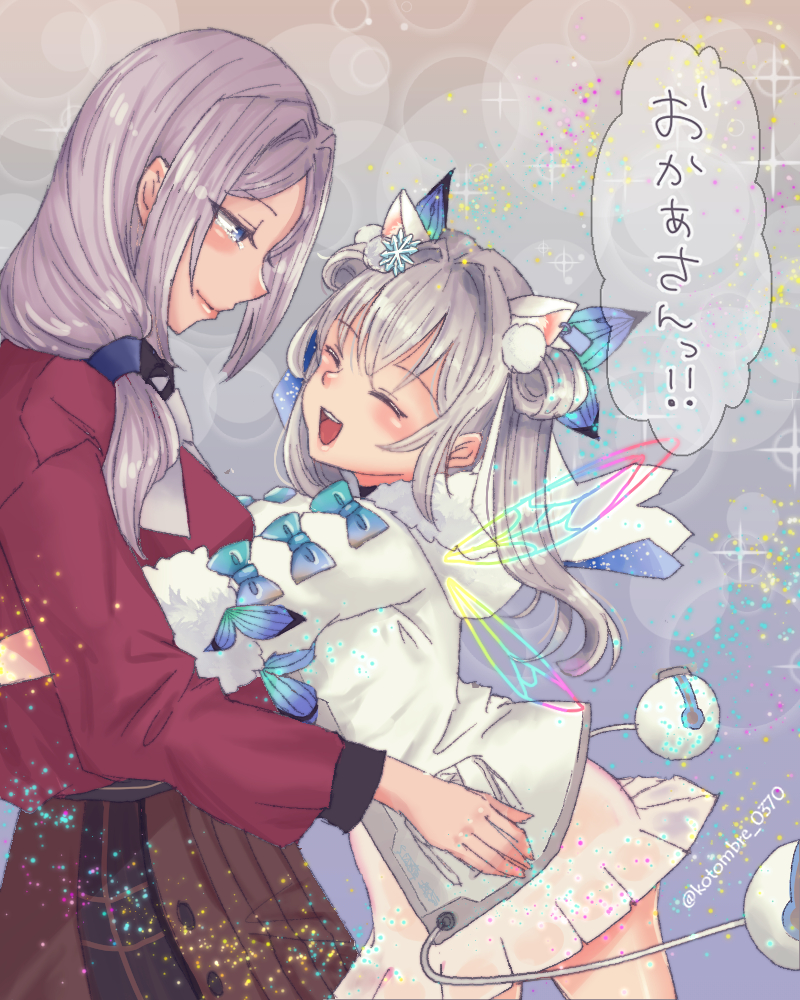2girls angelina_(nikke) animal_ear_fluff animal_ears blue_eyes blush butterfly_hair_ornament double_bun fur-trimmed_jacket fur-trimmed_sleeves fur_trim goddess_of_victory:_nikke hair_bun hair_ornament i_(kotombre_0370) jacket long_hair mature_female mother_and_child mother_and_daughter multiple_girls n102_(miracle_fairy)_(nikke) n102_(nikke) official_alternate_costume open_mouth parent_and_child rainbow_gradient smile snowflake_hair_ornament twintails white_hair white_jacket winged_hair_ornament