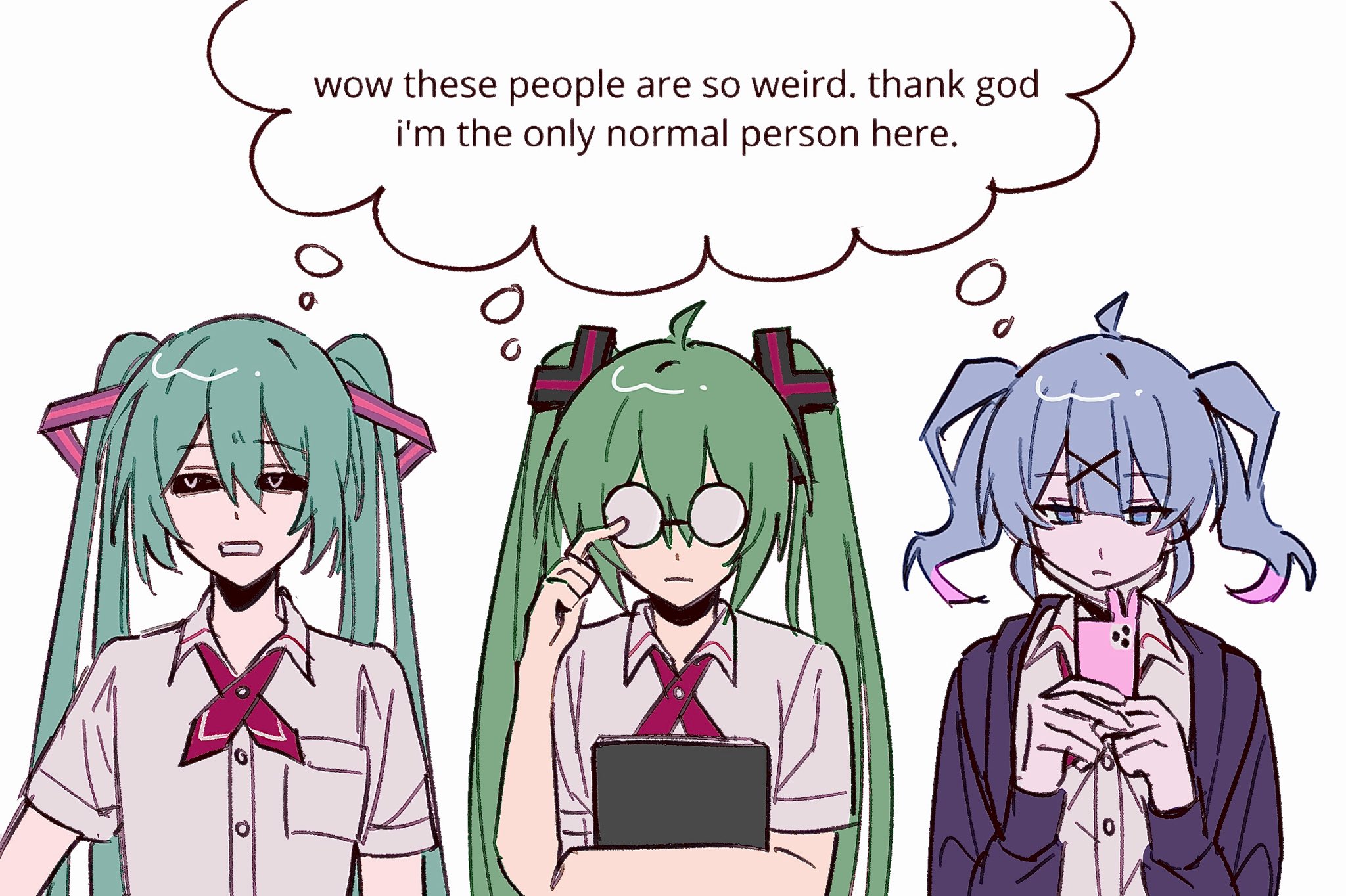 &{ID:11347866 CreatedAt:Fri Jan 24 03:15:44 -0600 2025 Score:43 Width:2048 Height:1364 MD5:7c2be2009b449355cb47893acfe9ba00 Directory:7c/2b Image:7c2be2009b449355cb47893acfe9ba00.jpg Rating:general Source:https://twitter.com/xomeku__/status/1882140726706016261 Change:1737710144 Owner:danbooru CreatorID:6498 ParentID:0 Sample:1 PreviewHeight:233 PreviewWidth:350 Tags:3girls adjusting_eyewear ahoge aqua_hair black_sclera blue_eyes blue_hair book closed_mouth collared_shirt colored_sclera confessions_of_a_rotten_girl_(vocaloid) cross_tie english_text eyebrows_hidden_by_hair glasses green_hair hair_between_eyes hair_ornament hatsune_miku highres holding holding_book jacket long_hair looking_at_phone looking_to_the_side mask mimukauwa_nice_try_(vocaloid) mouth_mask multicolored_hair multiple_girls multiple_persona opaque_glasses open_mouth phone purple_hair purple_jacket rabbit_hole_(vocaloid) school_uniform shirt short_sleeves songover speech_bubble thought_bubble twintails two-tone_hair white_background white_shirt x_hair_ornament xom0meku Title: HasNotes:false HasComments:false FileURL:https://img2.gelbooru.com/images/7c/2b/7c2be2009b449355cb47893acfe9ba00.jpg PreviewURL:https://gelbooru.com/thumbnails/7c/2b/thumbnail_7c2be2009b449355cb47893acfe9ba00.jpg SampleURL:https://img2.gelbooru.com/samples/7c/2b/sample_7c2be2009b449355cb47893acfe9ba00.jpg SampleHeight:566 SampleWidth:850 Status:active PostLocked:0 HasChildren:false IsVideo:false DisplayDate:24.01.2025 03:15}