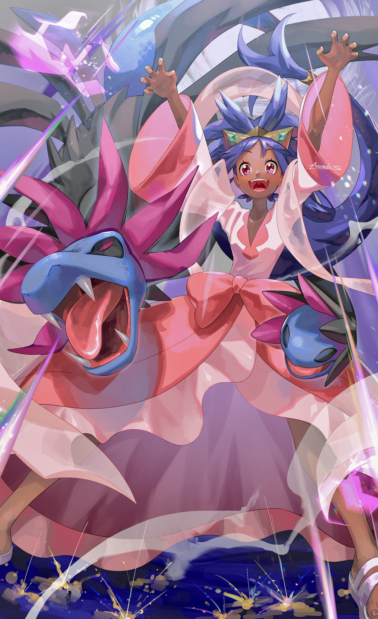 1girl :d arms_up bow claw_pose commentary_request dark-skinned_female dark_skin floating_hair gen_5_pokemon highres hydreigon iris_(pokemon) kado_51 legs_apart long_hair low-tied_long_hair nintendo open_mouth pink_bow pink_skirt pokemon pokemon_(creature) pokemon_black_2_and_white_2 see-through_scarf shirt shoes signature skirt smile tiara tongue v-neck white_footwear white_shirt wide_sleeves