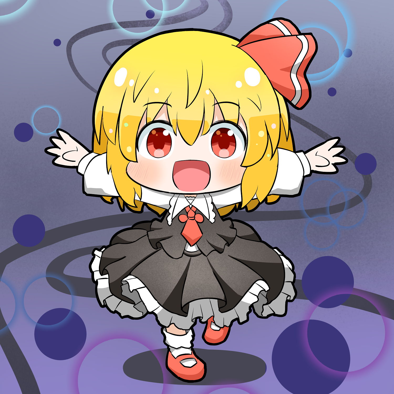 1girl :d ascot black_skirt black_vest blonde_hair blush collared_shirt commentary_request coruthi frilled_skirt frills full_body hair_ribbon highres long_sleeves looking_at_viewer mary_janes open_mouth outstretched_arms partial_commentary purple_background red_ascot red_eyes red_ribbon red_shoes ribbon rumia shirt shoes short_hair skirt skirt_set smile socks solo spread_arms touhou vest white_shirt white_socks