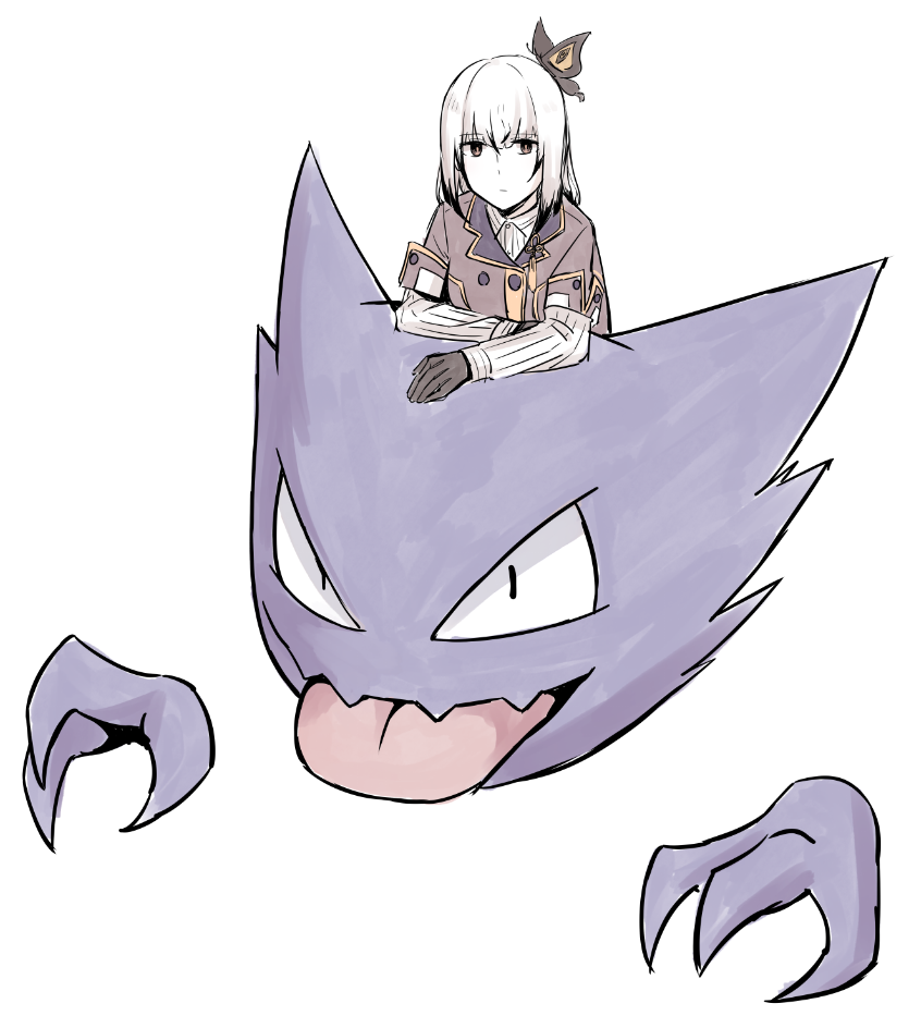 1girl aradama_(toji_no_miko) black_gloves black_hair blunt_bangs brown_eyes brown_jacket bug butterfly buttons closed_mouth collared_shirt colored_tips commentary_request crossover double-breasted gen_1_pokemon gloves haunter insect jacket jouhou long_sleeves looking_at_viewer medium_hair multicolored_hair nintendo origami_family's_elite_guard_uniform pokemon pokemon_(creature) satsuki_yomi shirt simple_background solo toji_no_miko white_background white_hair white_shirt