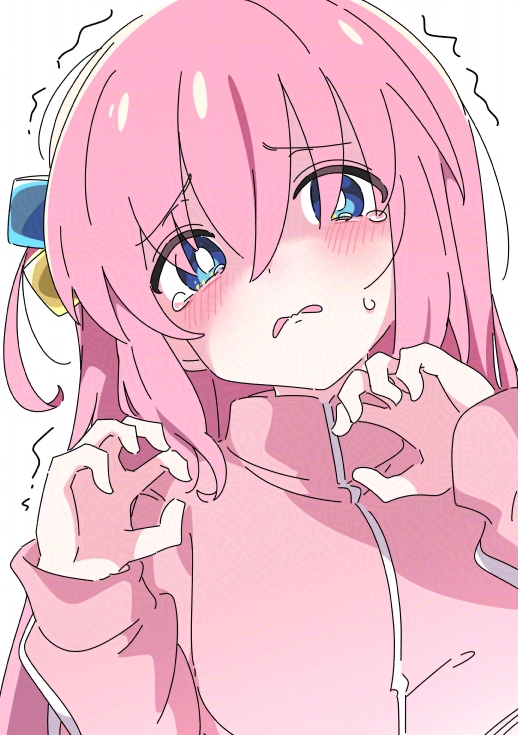 1girl adversarial_noise blue_eyes blush bocchi_the_rock! bright_pupils commentary cube_hair_ornament furrowed_brow gotoh_hitori hair_between_eyes hair_ornament hair_over_eyes hands_up ixy jacket long_hair long_sleeves looking_at_viewer one_side_up open_mouth pink_hair pink_jacket simple_background sleeves_past_wrists solo straight_hair tearing_up tears track_jacket trembling upper_body white_background white_pupils
