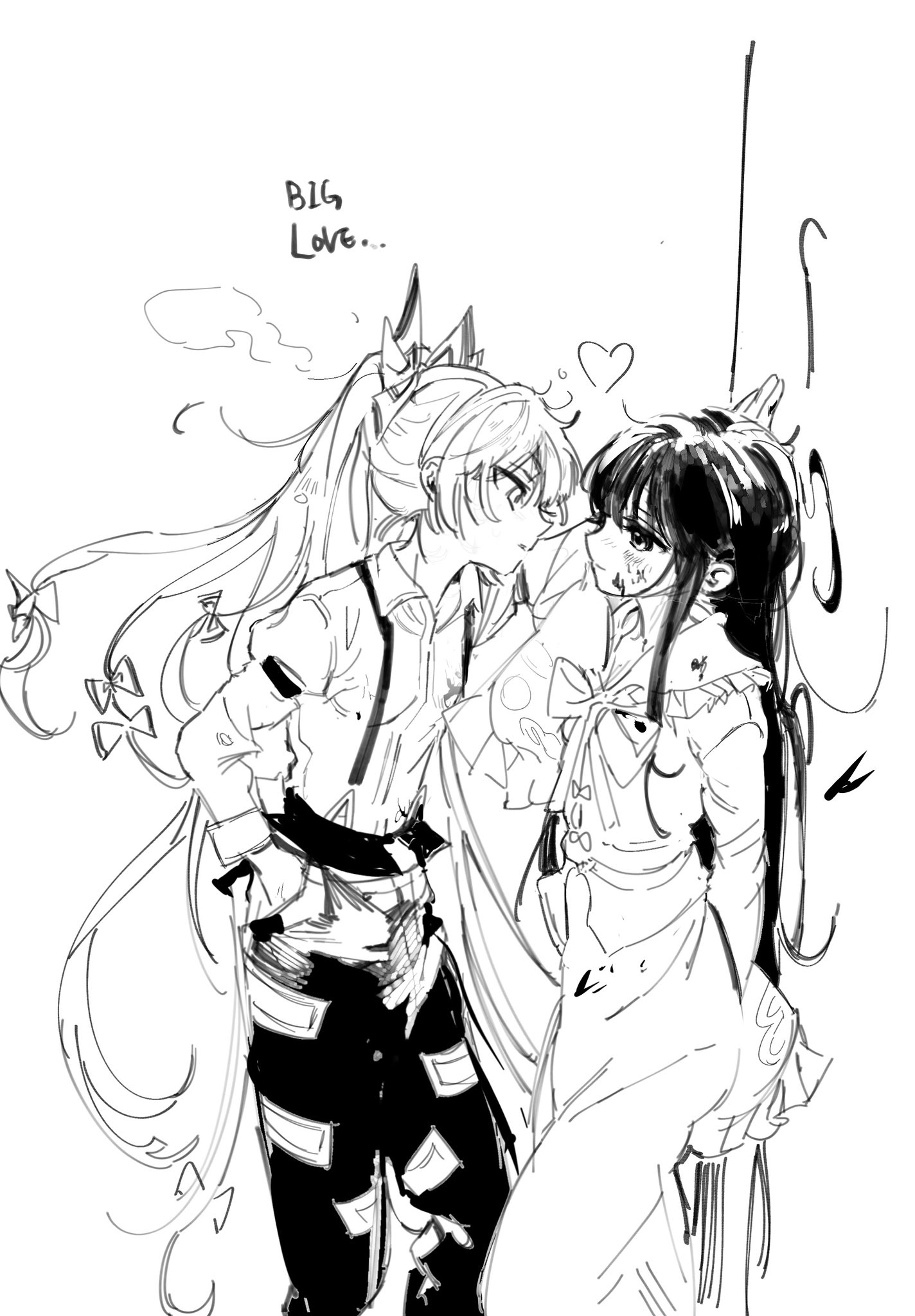 2girls against_wall black_hair blood blood_on_face bow english_text frilled_shirt frills fujiwara_no_mokou hair_between_eyes heart highres houraisan_kaguya long_hair long_sleeves looking_at_another monochrome multiple_girls pants puffy_sleeves ribbon sesmkun shirt skirt touhou very_long_hair white_hair white_shirt yuri