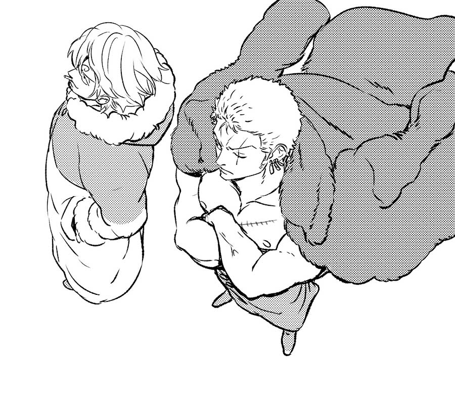2boys chief_(chiefvinsmoke) cigarette closed_mouth coat coat_on_shoulders crossed_arms curly_eyebrows earrings from_above greyscale hand_in_pocket hood hooded_coat jewelry male_focus monochrome multiple_boys one_piece roronoa_zoro sanji_(one_piece) scar scar_across_eye scar_on_face short_hair