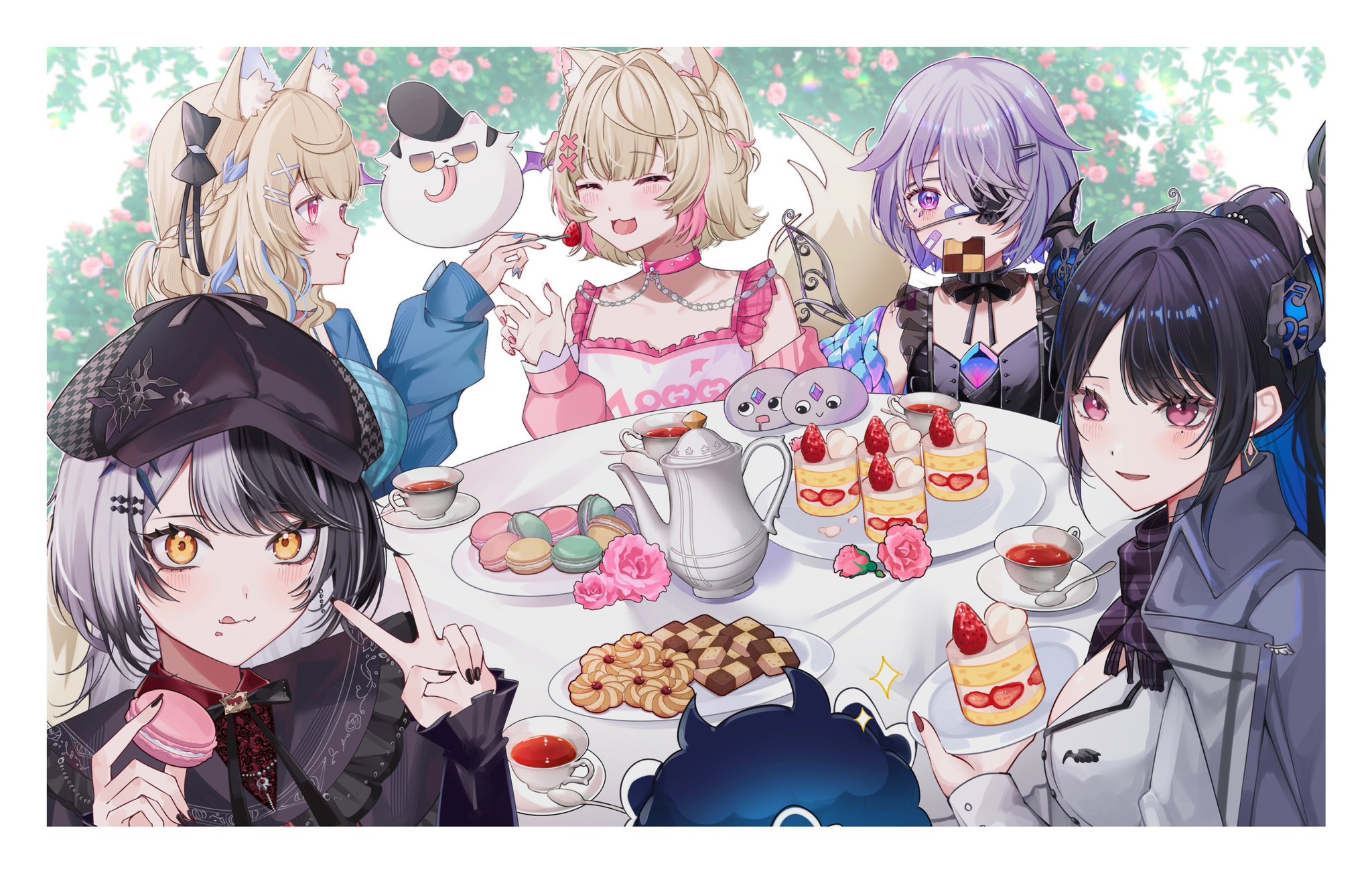 5girls animal_collar animal_ear_fluff animal_ears asymmetrical_horns bandaid bandaid_on_cheek bandaid_on_face bandaid_on_nose biscuit_(bread) black_hair blonde_hair blue_hair blunt_bangs border bow bowtie braid breasts cake capelet chest_jewel choker clothes_writing coat coat_on_shoulders collar cookie cup deerstalker demon_horns detective dog_ears dog_girl dog_tail earrings eyepatch familiar feeding fingernails flower flower_wreath food food_in_mouth food_on_face fork frilled_capelet frilled_collar frilled_shirt frilled_sleeves frills fuwawa_abyssgard fuwawa_abyssgard_(casual) grey_hair hair_ornament hair_over_one_eye hashtag-only_commentary hat highres holding holding_food holding_fork hololive hololive_english horns jacket jailbird_(nerissa_ravencroft) jewelry koseki_bijou koseki_bijou_(casual) long_hair long_sleeves looking_at_another looking_at_viewer medium_hair mococo_abyssgard mococo_abyssgard_(casual) mouth_hold multicolored_hair multiple_girls nail_polish nerissa_ravencroft nerissa_ravencroft_(casual) office_lady official_alternate_costume official_alternate_hair_length official_alternate_hairstyle open_clothes open_coat open_jacket pebble_(koseki_bijou) perroccino_(fuwamoco) pink_eyes pink_flower pink_rose plate ponytail purple_eyes purple_hair red_eyes rose round_table shiori_novella shiori_novella_(casual) shirt short_hair split-color_hair spoon strawberry_shortcake swept_bangs table tail tea teacup teapot v virtual_youtuber white_border wing_collar yellow_eyes yuru._(m29125567)