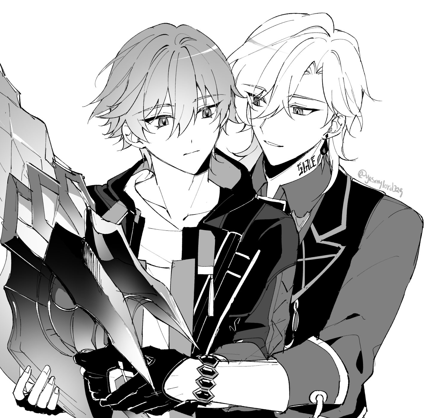 2boys artist_name aventurine_(honkai:_star_rail) bracelet caelus_(honkai:_star_rail) closed_mouth coat collar collarbone collared_shirt earrings fingerless_gloves fingernails gem gloves greyscale hair_between_eyes highres holding holding_sword holding_weapon honkai:_star_rail honkai_(series) hood hooded_coat jewelry lapels long_sleeves looking_at_another male_focus monochrome multiple_boys neck_tattoo open_clothes open_coat shirt short_hair simple_background single_earring smile sword t-shirt tattoo teeth trailblazer_(honkai:_star_rail) two-sided_coat two-sided_fabric upper_body vest weapon yaoi yesmylord329