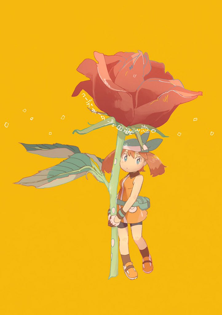 1girl bandana brown_hair fanny_pack flower green_bandana may_(pokemon) michi_(komitiba) mini_person minigirl nintendo orange_shoes pokemon pokemon_(anime) pokemon_the_series:_diamond_and_pearl red_flower red_rose rose shoes solo yellow_background
