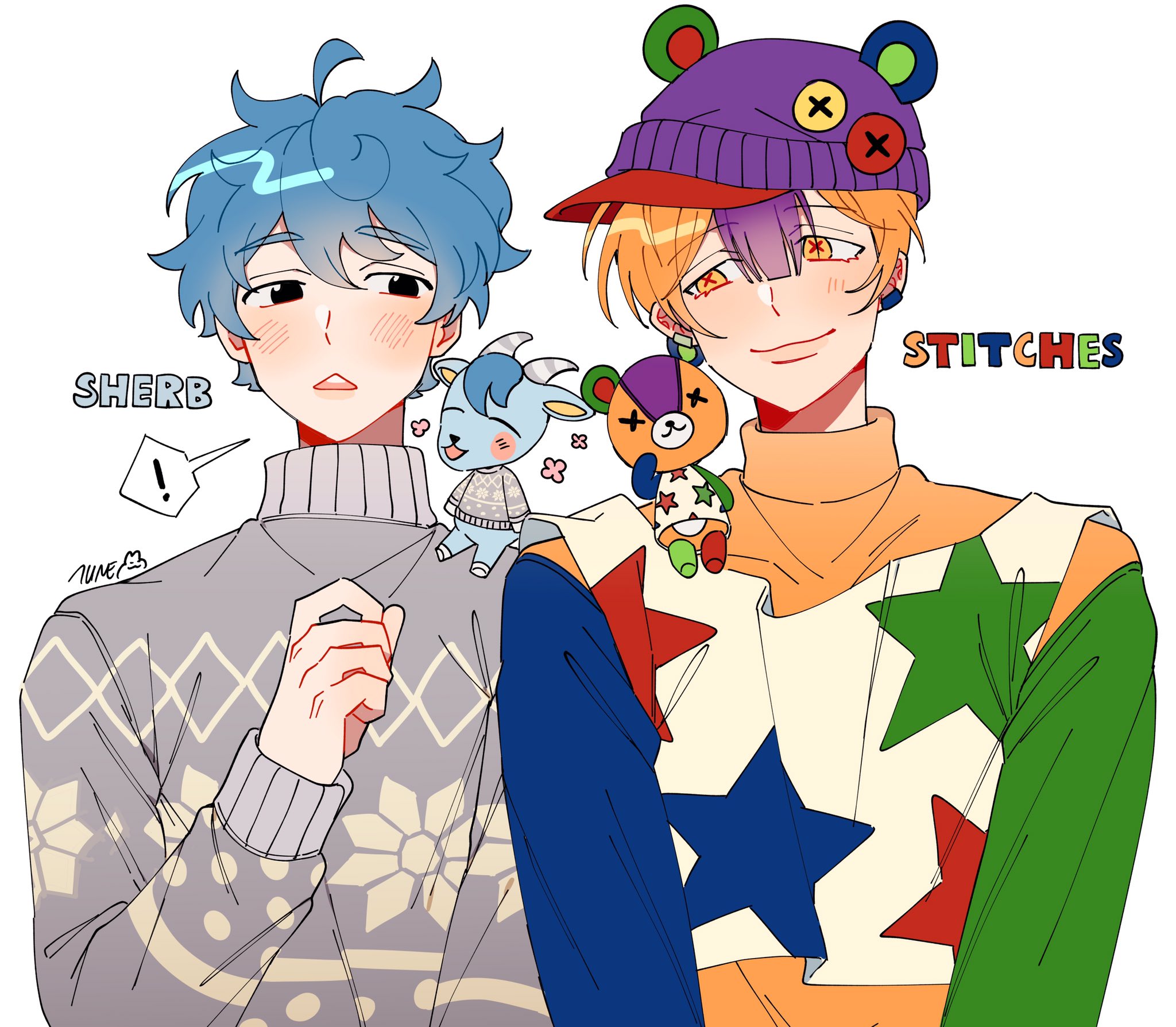 ! 2boys ahoge animal animal_crossing animal_ear_headwear animal_ears animal_on_shoulder asymmetrical_sleeves beanie bear bear_ears black_eyes blue_hair blue_sleeves character_name closed_mouth clothed_animal creature_and_personification deer ear_piercing fake_animal_ears green_sleeves grey_sweater hand_up hat highres lips long_sleeves looking_at_another majunjuu male_focus messy_hair mismatched_sleeves multicolored_hair multiple_boys nintendo orange_eyes orange_hair orange_sweater personification piercing purple_hair purple_hat red_hat red_pupils sherb_(animal_crossing) signature simple_background smile snowflake_print spoken_exclamation_mark star_(symbol) star_print stitches_(animal_crossing) sweater symbol-shaped_pupils teeth triangle_mouth turtleneck turtleneck_sweater two-tone_hair upper_body upper_teeth_only vest visor_cap white_background white_vest x-shaped_pupils