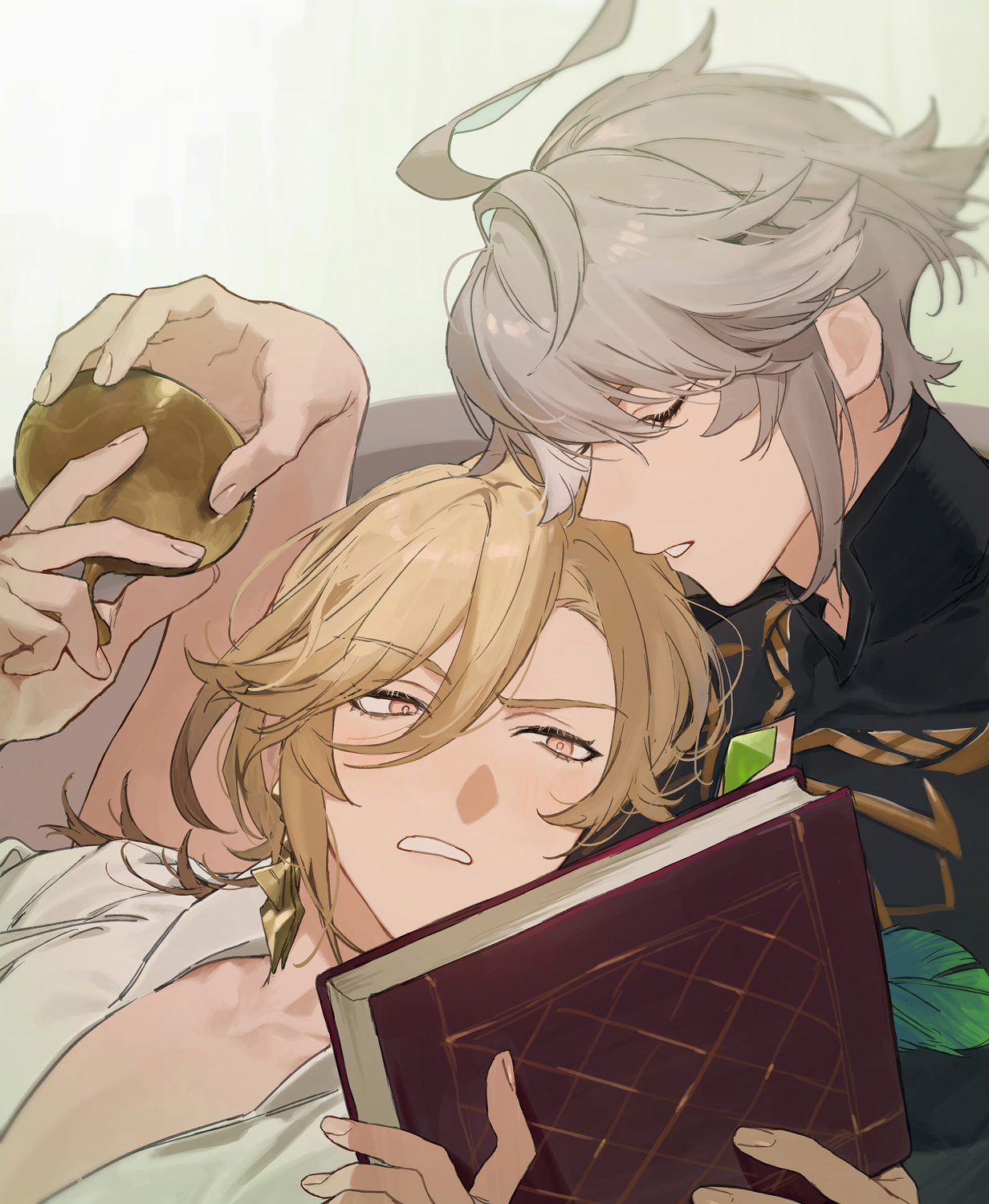 2boys ahoge alhaitham_(genshin_impact) black_shirt blonde_hair book compression_shirt earrings frown gem genshin_impact gold_earrings green_gem grey_hair hair_between_eyes head_on_another's_shoulder highres holding holding_book jewelry kaveh_(genshin_impact) looking_down male_focus multiple_boys onononnu_u open_clothes parted_bangs parted_lips red_eyes shirt short_hair sleeveless sleeveless_shirt upper_body white_shirt yaoi