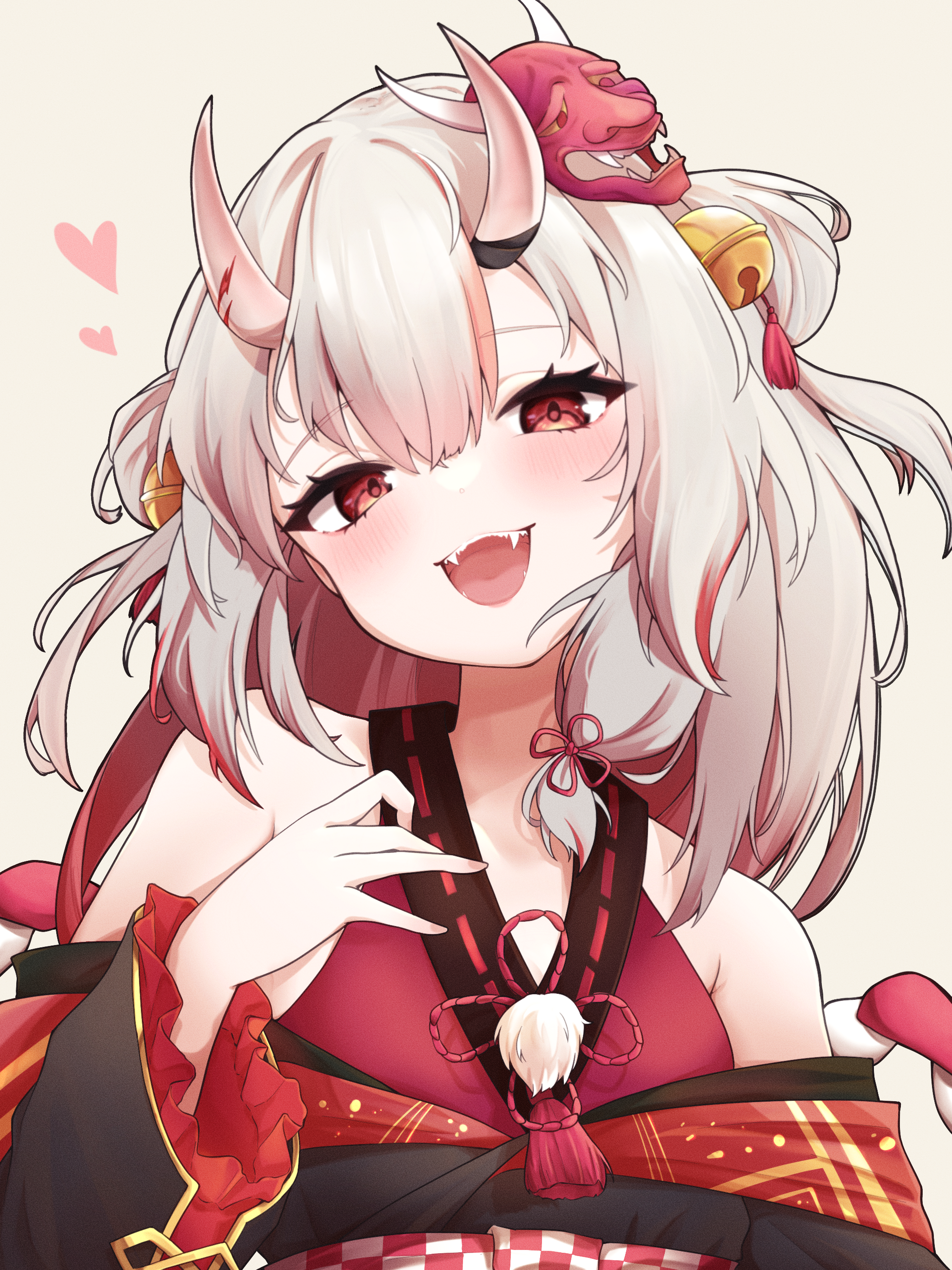 1girl absurdres alternate_hair_length alternate_hairstyle bell blush fangs gradient_hair grey_hair hair_bell hair_ornament heart highres hololive horns japanese_clothes jingle_bell kimono long_hair looking_at_viewer low_twintails mask matcha_amigo medium_hair multicolored_hair nakiri_ayame nakiri_ayame_(1st_costume) oni oni_mask red_hair red_kimono skin-covered_horns sleeveless sleeveless_kimono smile solo streaked_hair twintails virtual_youtuber white_background
