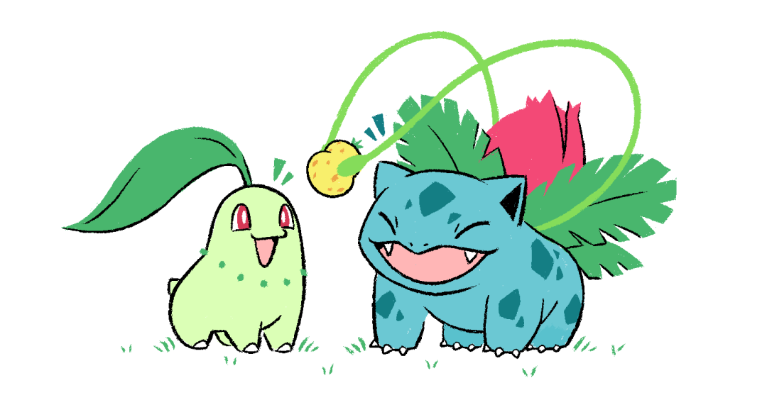 berry_(pokemon) bright_pupils chikorita claws closed_eyes commentary english_commentary fangs full_body gen_1_pokemon gen_2_pokemon gotchibam happy ivysaur nintendo no_humans open_mouth plant pokemon pokemon_(creature) red_eyes simple_background sitrus_berry standing vines white_background white_pupils