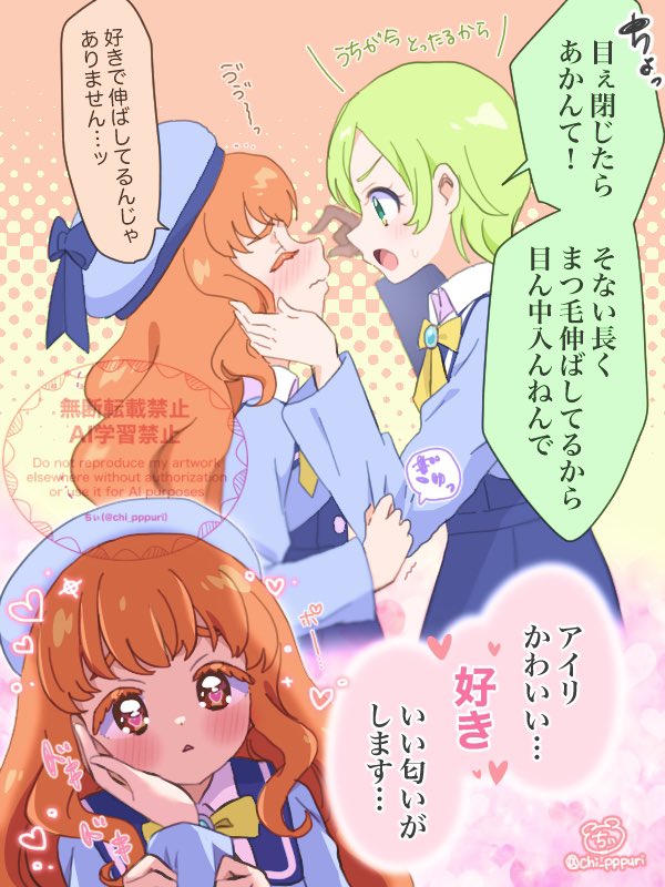 blue_dress blue_hat blue_shirt blush bow brooch chii_(chi_pppuri) closed_eyes colored_eyelashes copyright_notice dress from_side green_eyes green_hair hand_on_another's_cheek hand_on_another's_face hands_up hat heart heart-shaped_pupils himitsu_no_aipri jewelry long_hair long_sleeves mitsuba_airi multiple_views open_mouth orange_background orange_hair paradise_private_academy_school_uniform parted_lips pink_pupils pretty_series raised_eyebrows school_uniform shinomiya_rinrin shirt short_hair sound_effects speech_bubble standing sweat symbol-shaped_pupils translation_request triangle_mouth twitter_username v-shaped_eyebrows watermark wavy_hair yellow_background yellow_bow