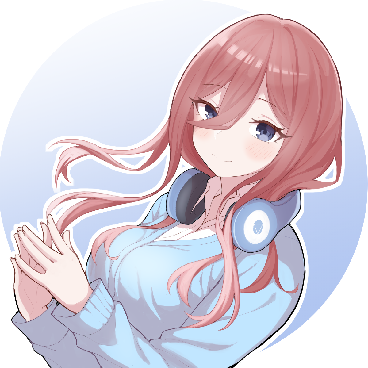 1girl blue_background blue_cardigan blush border breasts brown_hair cardigan closed_mouth collared_shirt commentary dress_shirt go-toubun_no_hanayome gradient_background hair_between_eyes headphones headphones_around_neck highres large_breasts long_hair_between_eyes long_sleeves loosely_tucked_bangs nakano_miku open_collar outline outside_border round_border shirt smile solo split_mouth steepled_fingers upper_body white_border white_outline white_shirt yuu_(shampoohatslime)