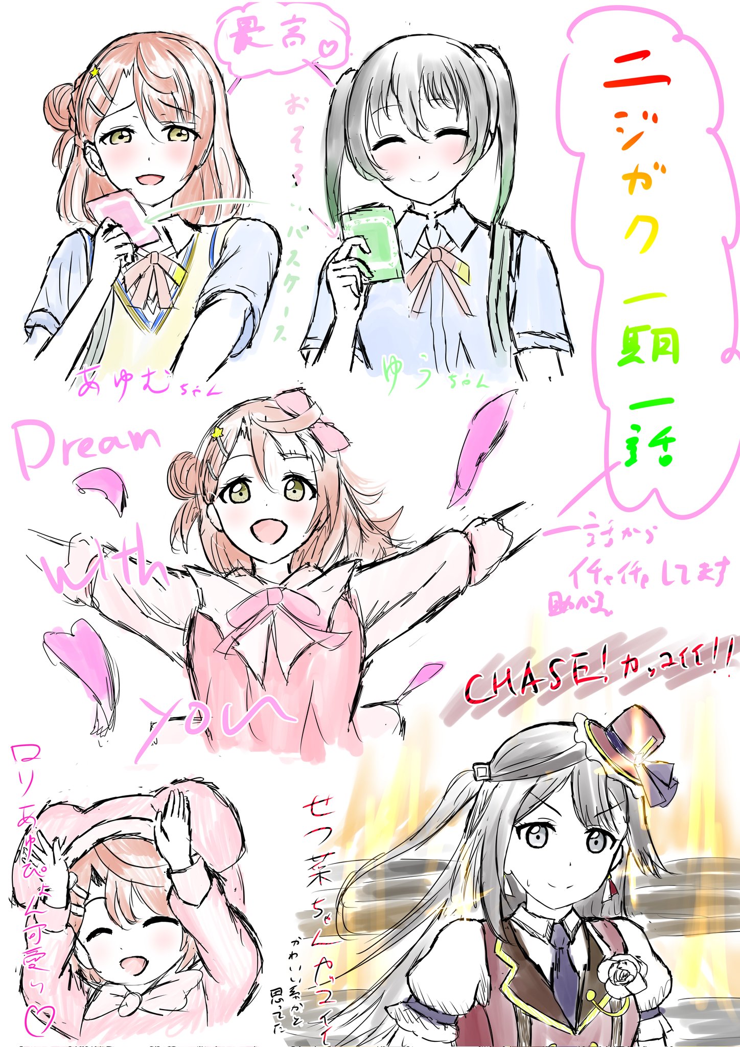 >:) 3girls :d ^_^ aged_down animal_costume arrow_(symbol) black_hair black_necktie blue_shirt blunt_bangs blush braid bun_with_braided_base chase!_(love_live!) closed_eyes closed_mouth collared_shirt commentary_request dream_with_you_(love_live!) dress dress_shirt embarrassed fire gradient_hair green_hair grey_eyes hair_between_eyes hair_bun hair_ornament hairclip half_updo highres holding long_hair love_live! love_live!_nijigasaki_high_school_idol_club medium_hair multicolored_hair multiple_girls multiple_views neck_ribbon necktie nijigasaki_school_uniform official_alternate_costume one_side_up open_mouth orange_hair pink_dress pink_ribbon puffy_short_sleeves puffy_sleeves rabbit_costume rabbit_pose red_vest ribbon school_uniform shirt short_sleeves single_side_bun smile split_mouth summer_uniform sweatdrop sweater_vest swept_bangs takasaki_yu tenppp translation_request twintails two-tone_hair uehara_ayumu v-shaped_eyebrows vest white_shirt yellow_eyes yellow_sweater_vest yuki_setsuna