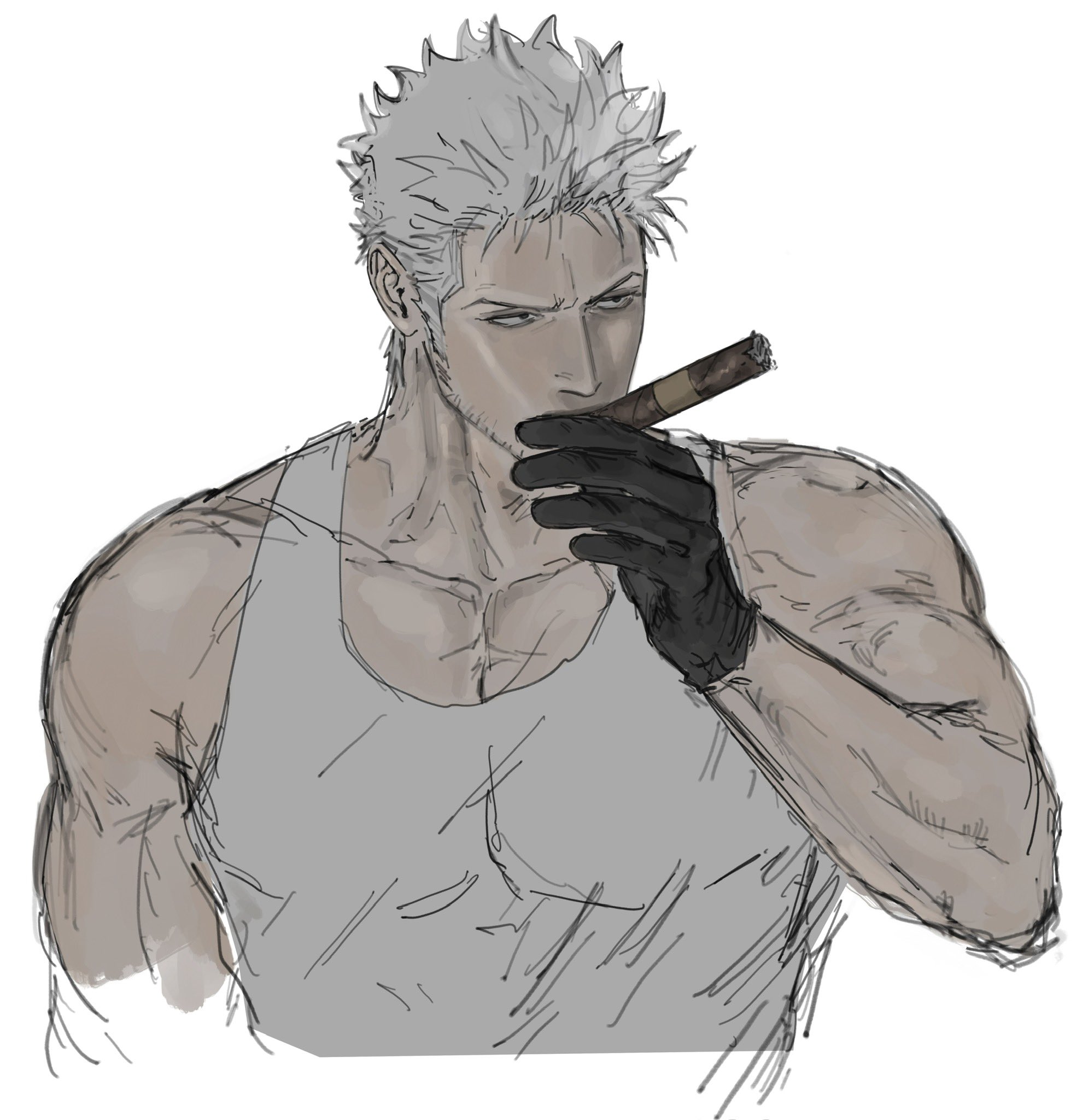 1boy black_eyes black_gloves cigarette collarbone commentary covered_mouth english_commentary facial_hair forehead gloves hand_up highres holding holding_cigarette junkboh male_focus muscular muscular_male one_piece pectoral_cleavage pectorals roronoa_zoro serious short_bangs short_hair simple_background smoking stubble tank_top upper_body very_short_hair white_background white_hair white_tank_top