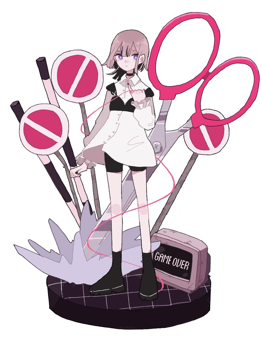 1girl :/ baka_janai_noni_(zutomayo) black_bustier black_choker black_footwear black_hair black_nails black_shorts boots bustier choker closed_mouth colored_inner_hair dress_shirt expressionless fingernails floating_clothes floating_hair highres multicolored_hair nira-chan nira-chan_(baka_janai_noni)_(zutomayo) pink_hair purple_eyes road_sign scissors shima_seaotter shirt shorts sign standing streaked_hair string string_of_fate television white_shirt zutto_mayonaka_de_ii_no_ni