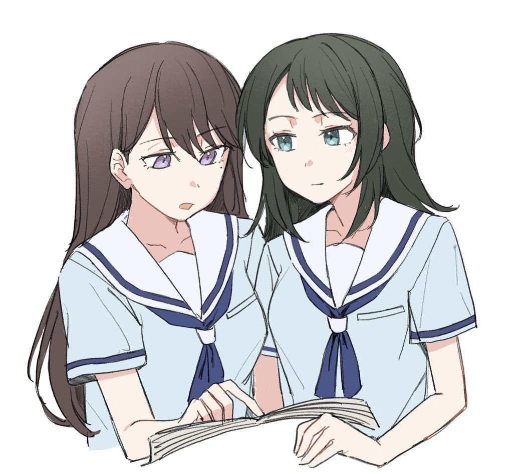 2girls bang_dream! bang_dream!_it's_mygo!!!!! blue_eyes blue_neckerchief blue_shirt brown_hair closed_mouth collarbone commentary green_hair hanasakigawa_school_uniform hashtag-only_commentary jenjen long_hair medium_hair mole mole_under_eye multiple_girls neckerchief open_mouth purple_eyes sailor_collar school_uniform serafuku shiina_taki shirt short_sleeves sidelocks white_sailor_collar yahata_umiri